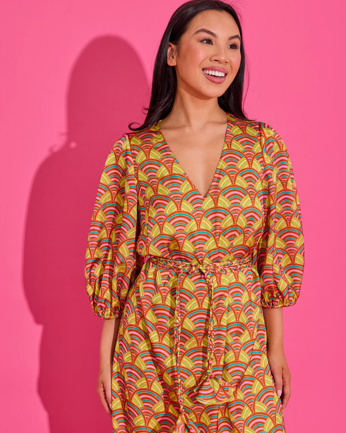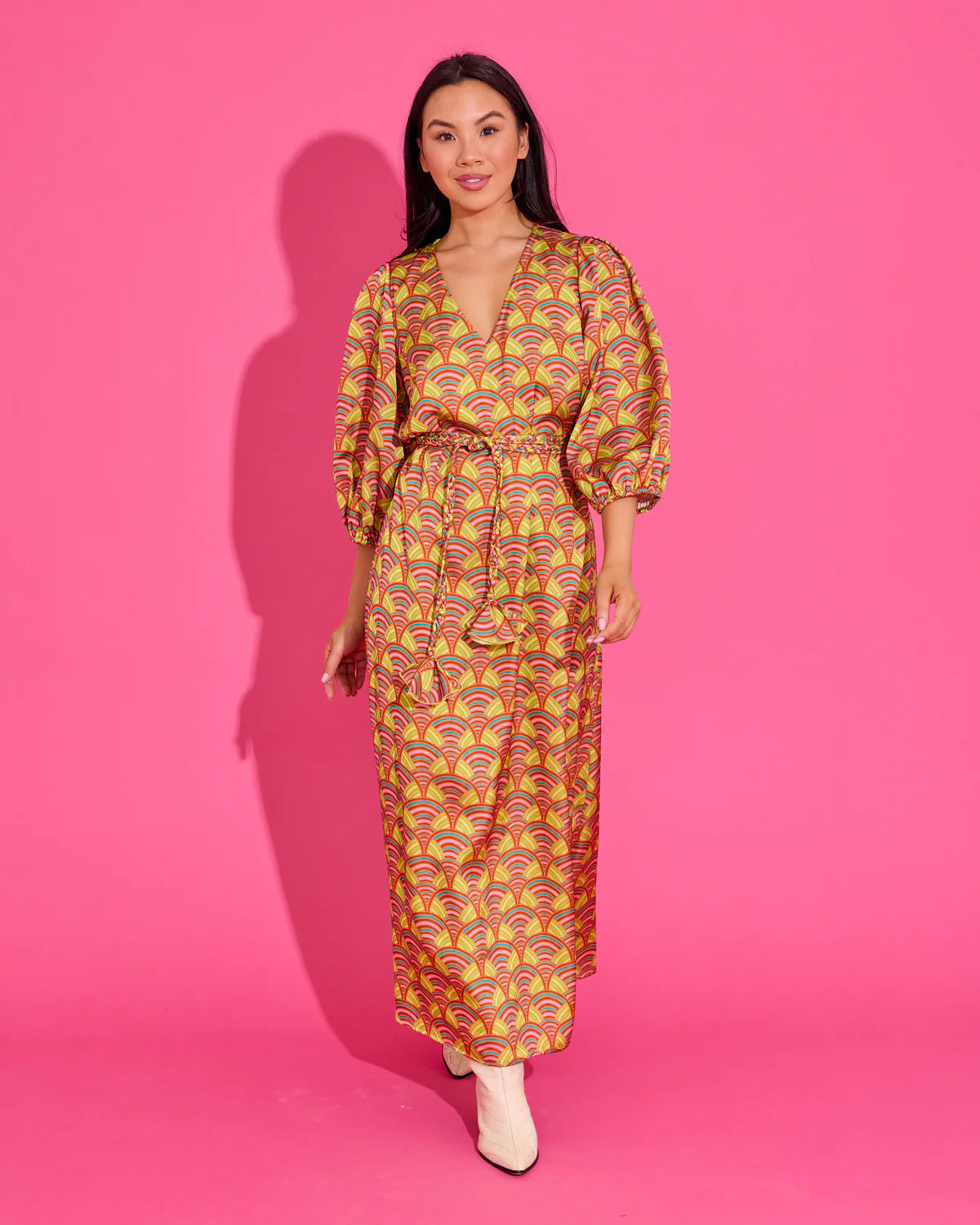 The Lizzie Dress is back for fall! In our tightrope print, this dress offers a v neckline, puff sleeves, a braided tassel belt and maxi skirt.