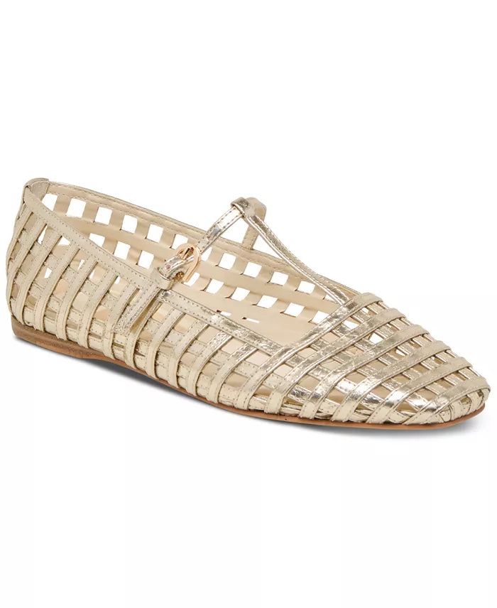 From Dolce Vita, the Rains Metallic Woven T-Strap Ballet Flats feature:
