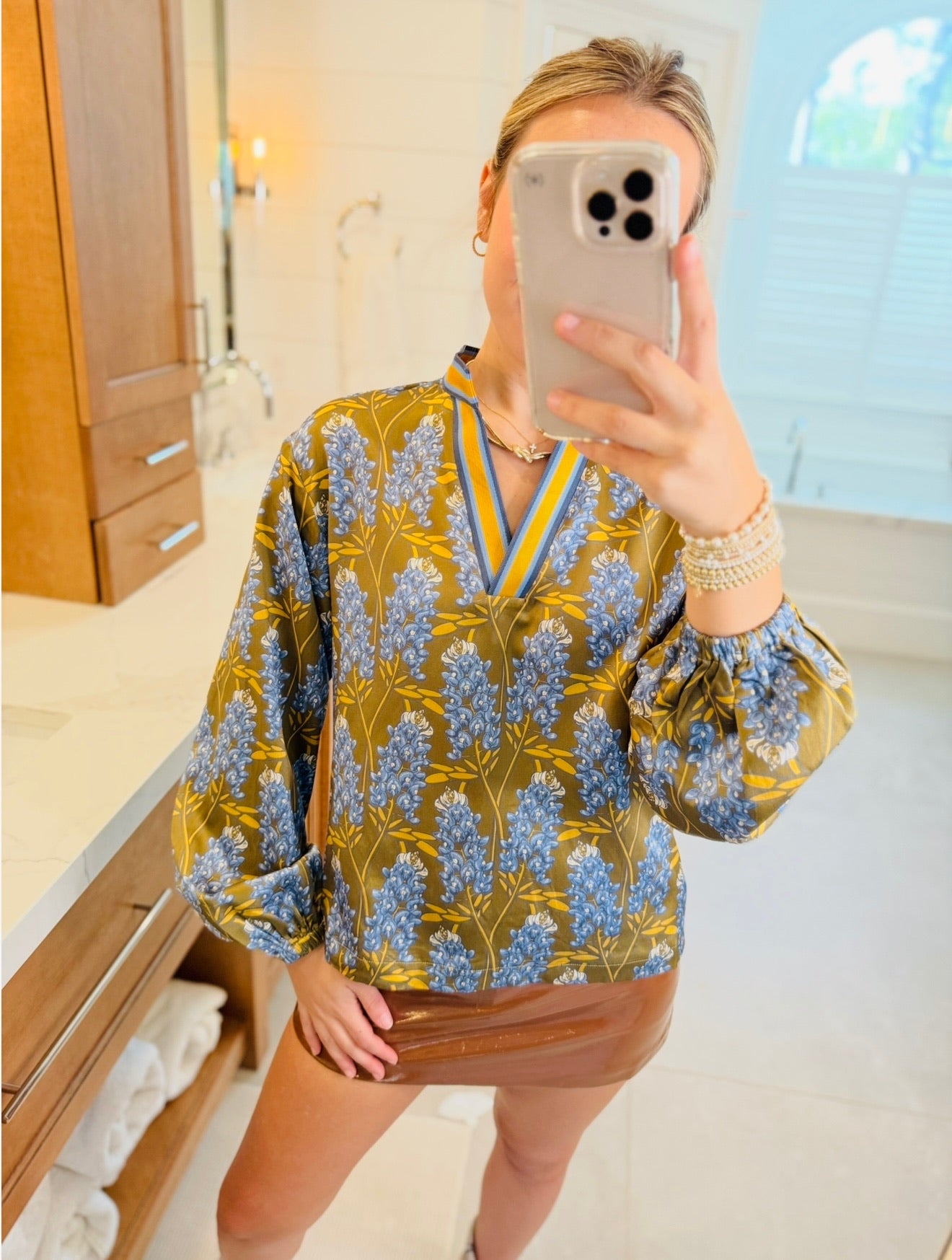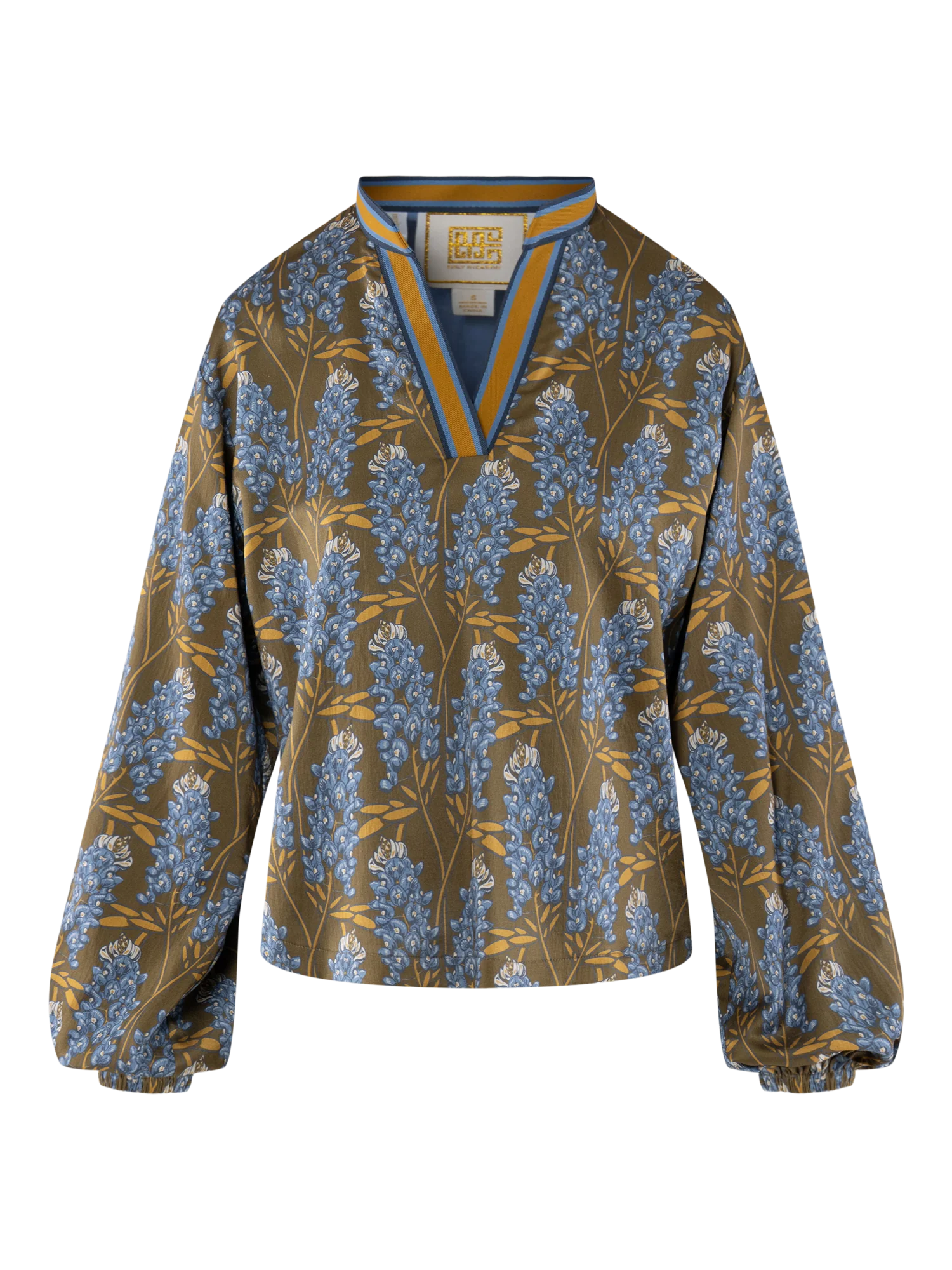 The Lolli Top blends feminine ease with a touch of western charm. Designed with blouson sleeves finished in elastic cuffs, a notched neckline, and a relaxed yet slightly tailored silhouette, it offers both comfort and polish. The Blue Bonnet print celebrates the Texas state flower, reimagined in soft botanicals that bring a western-inspired, chic twist to this timeless style. Effortlessly versatile, it’s a piece that transitions seamlessly from casual outings to elevated occasions.