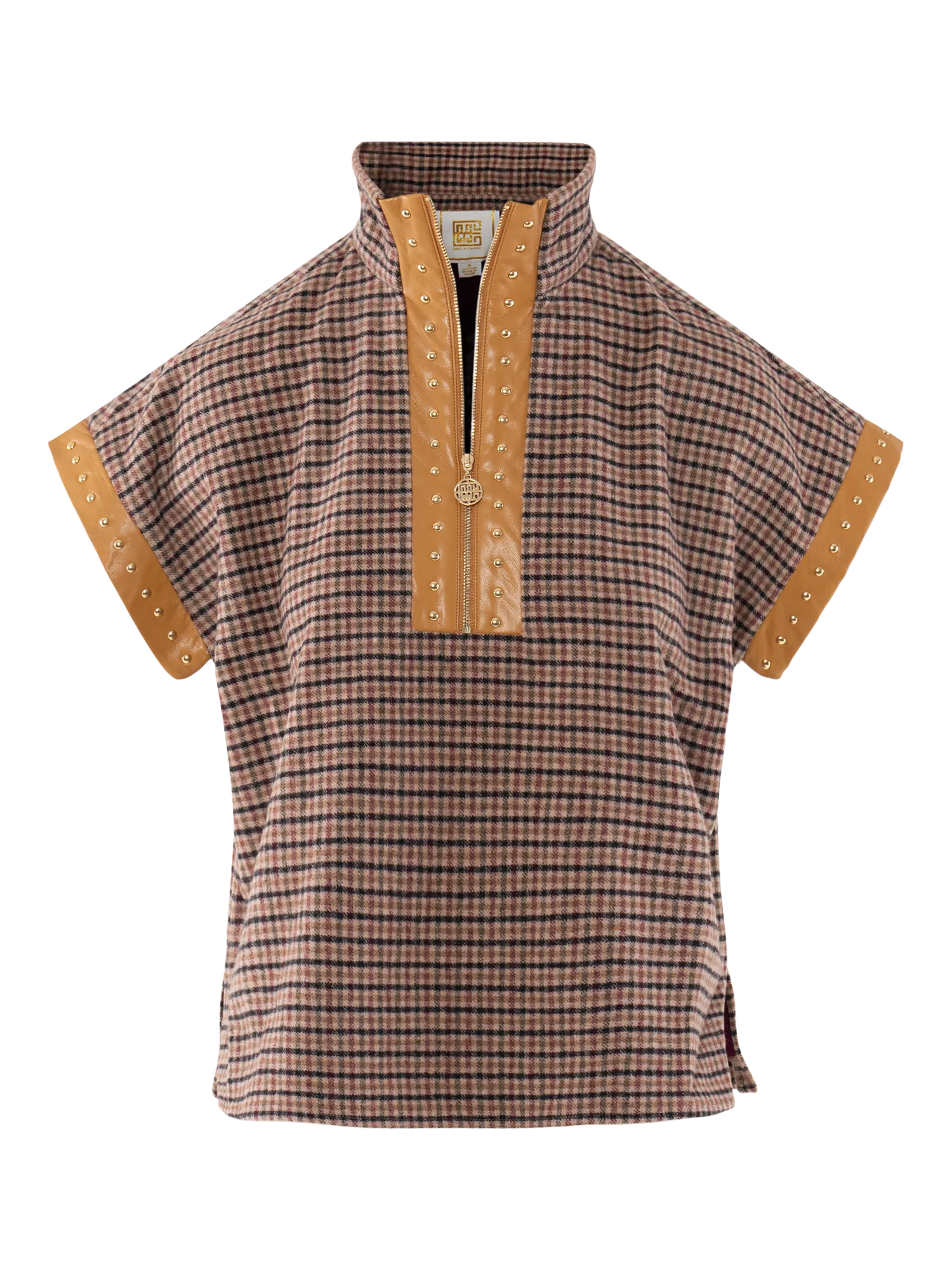 A modern take on timeless tweed, this top blends structure with statement details. Designed with short dolman sleeves and a slightly tailored fit, it’s both comfortable and polished. The ¾ zip neckline is finished with a signature gold logo pull, while vegan leather trim accented with gold studs adds an edgy, luxe touch. The tweed print reimagines classic check in warm autumnal hues, giving this piece a chic seasonal update in a wool-blend fabrication.