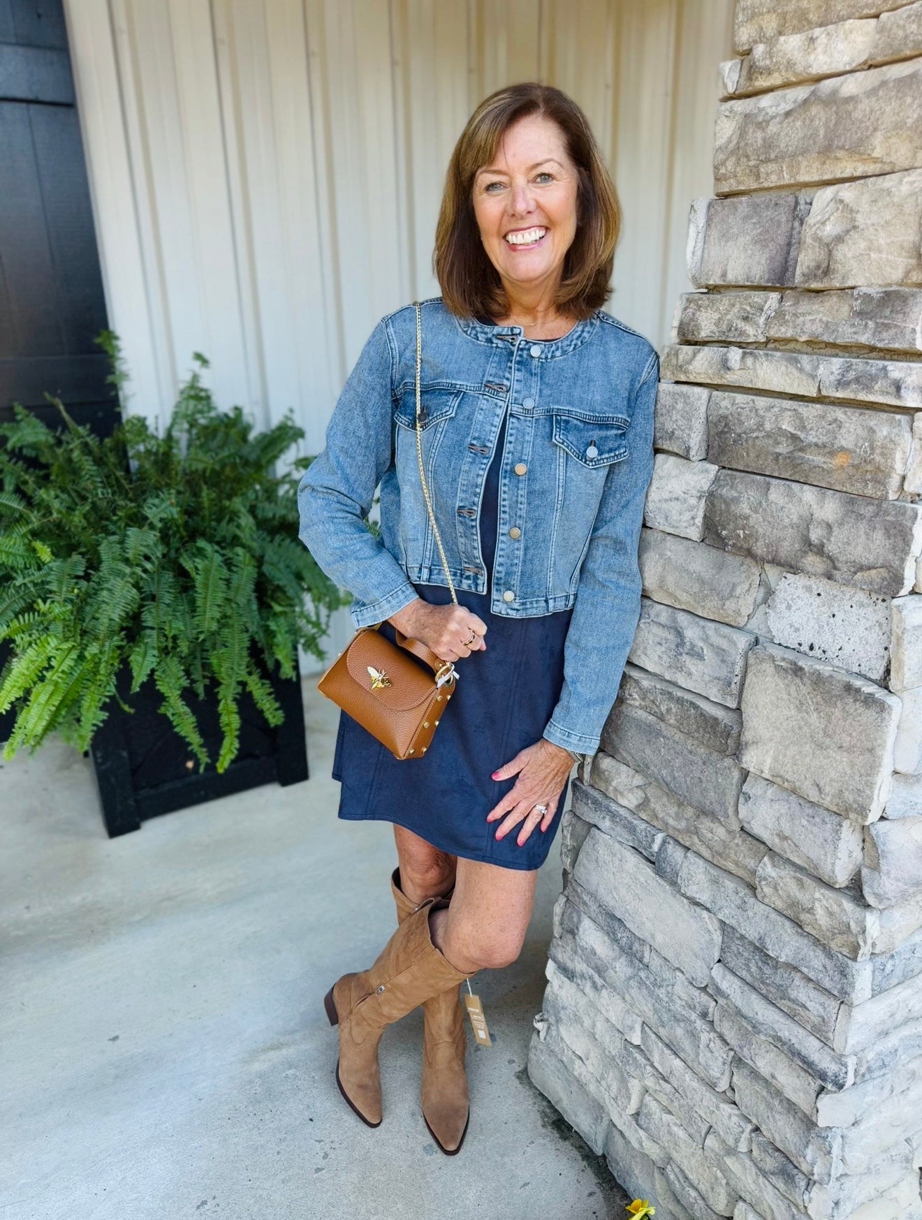 Collarless Jean Jacket with pocket detail. Ivy Model is wearing the large!
