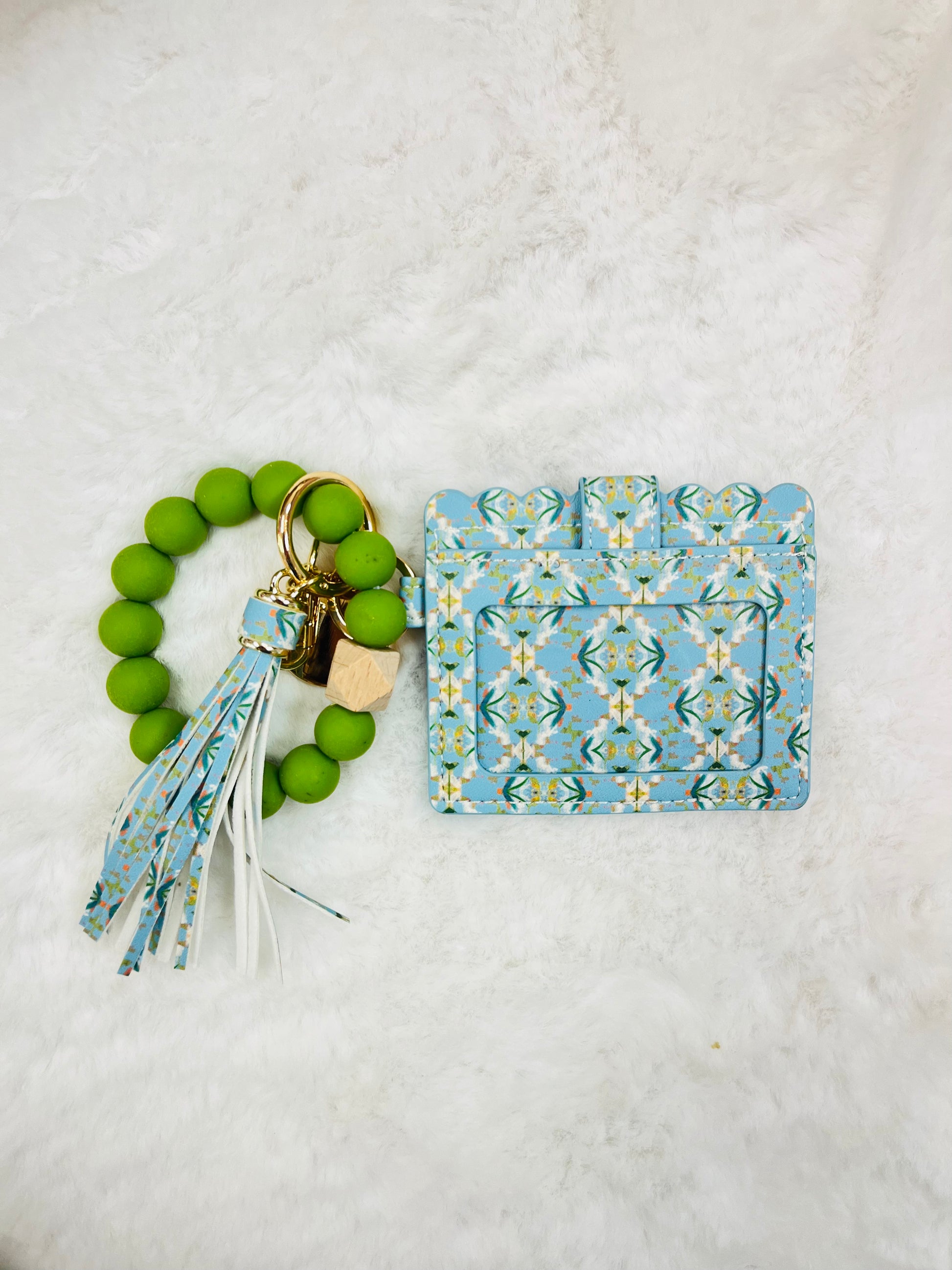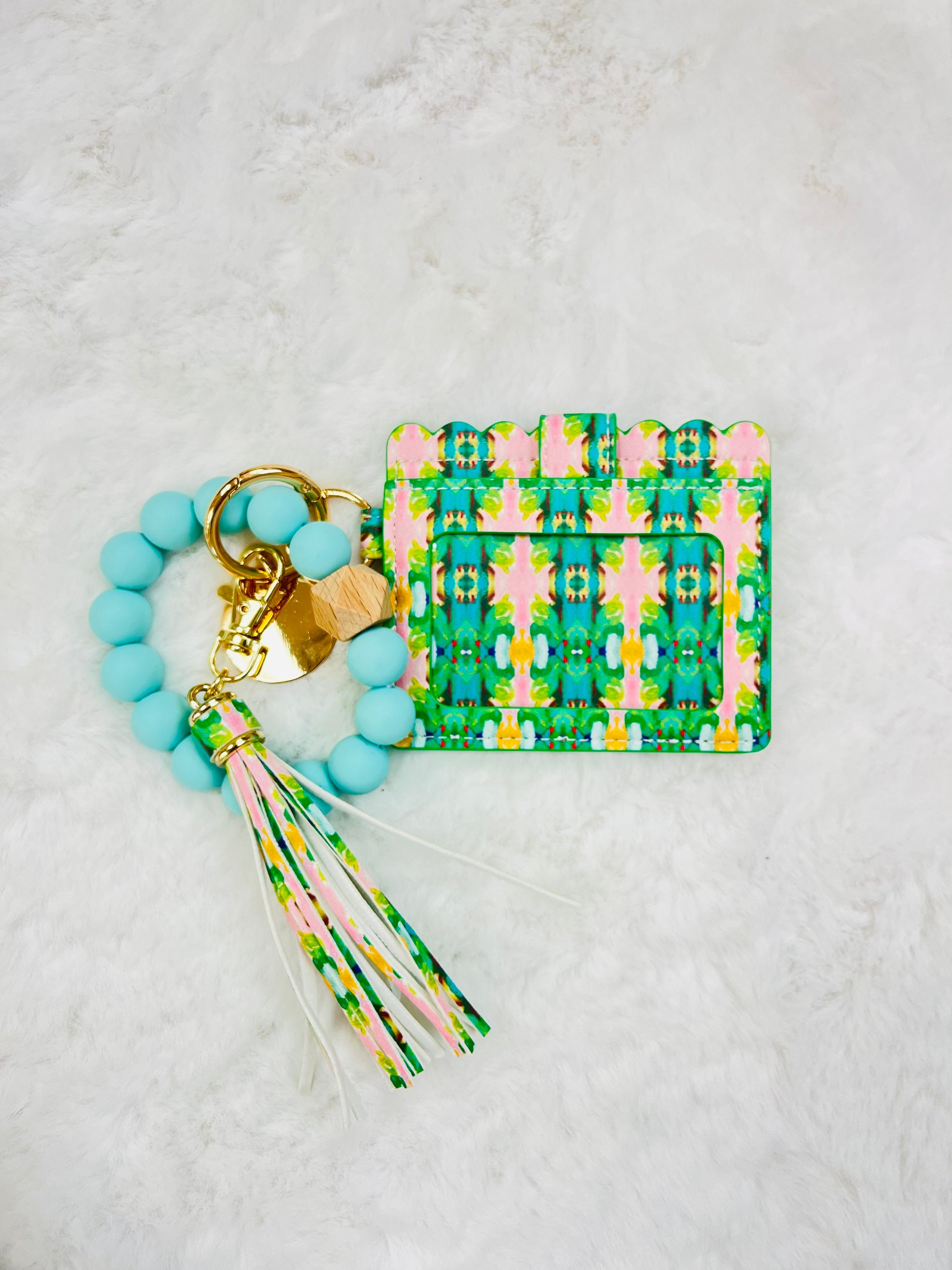 Stay stylish on-the-go with our wristlet keychain wallets – perfect for the do-it-all woman. Colorful silicone beads and a hexagonal wood accent offer mobility and convenience. Slip them on/off while running errands. This 3-in-1 accessory holds essentials like ID, credit card, cash, and keys. The leathered scallop design and chic tassel make a bold statement for gals with style.