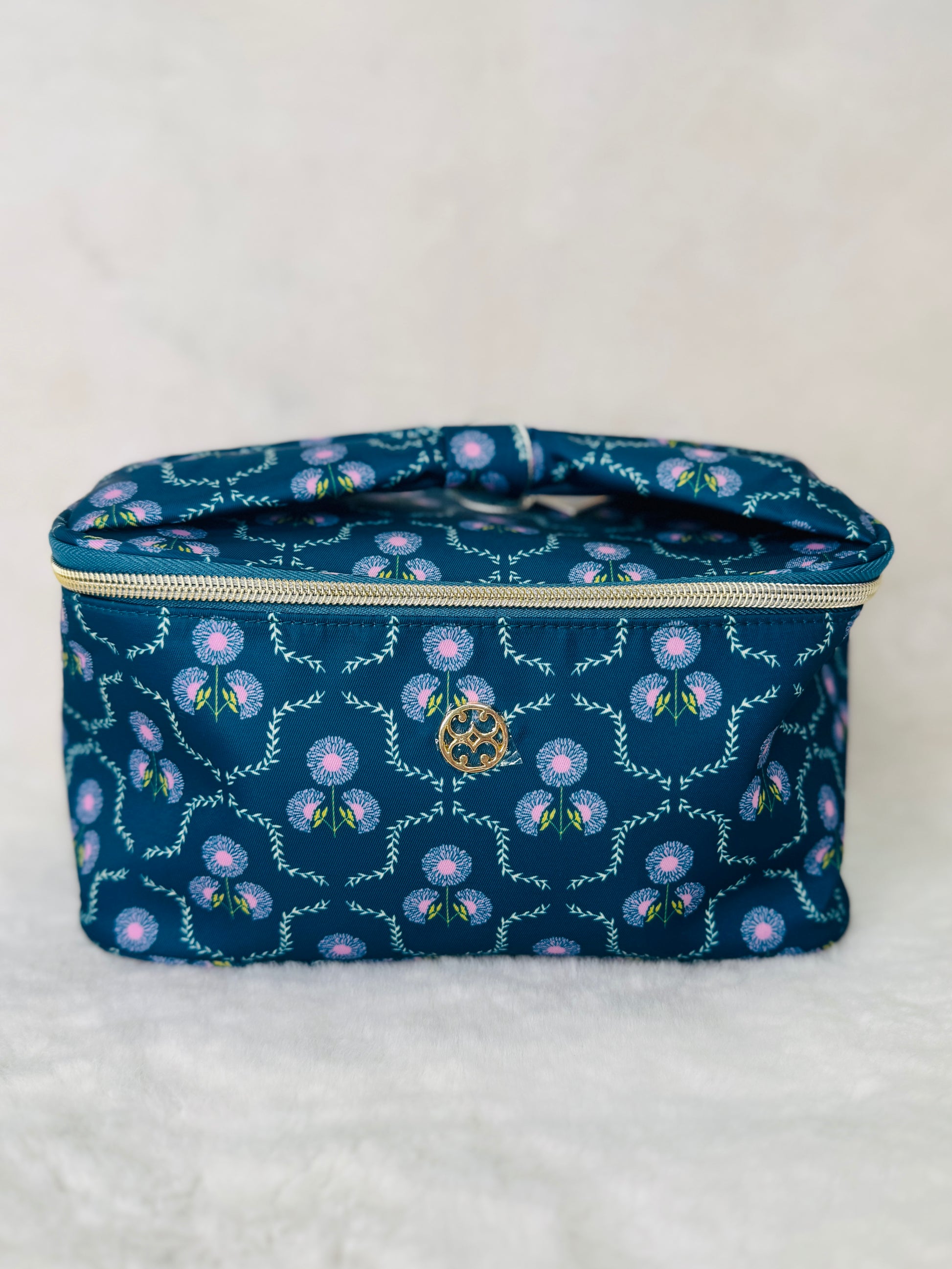 Nylon zipper makeup bag. Easy to clean. Gold zipper hardware. Measures 10" wide by 5" tall. Great for makeup when you are on-the-go. Knot tie handle on top for easy carry.