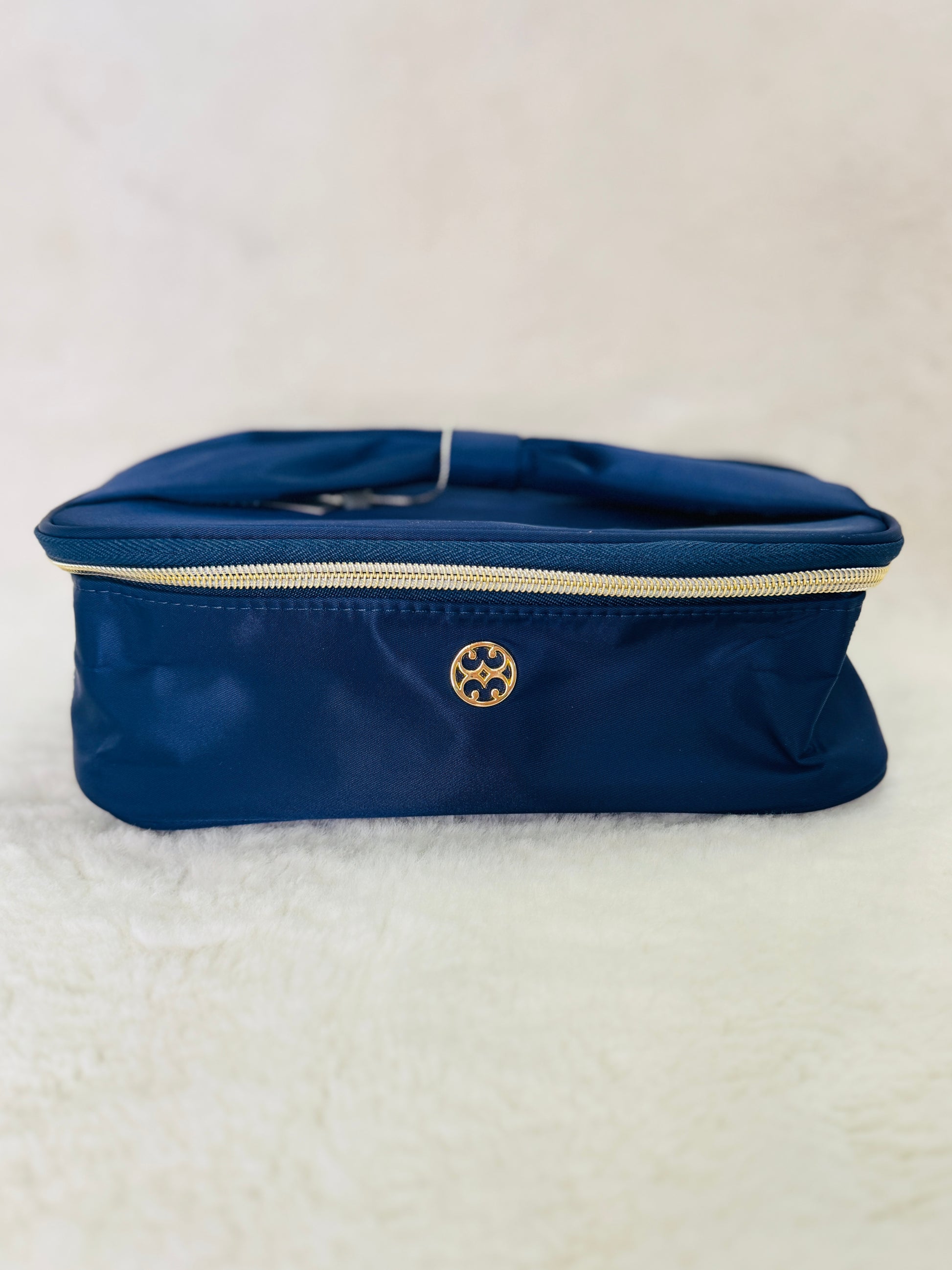 Nylon zipper makeup bag. Easy to clean. Gold zipper hardware. Measures 10" wide by 3.5" tall. Great for toiletries when you are on-the-go. Knot tie handle on the top for easy carry.