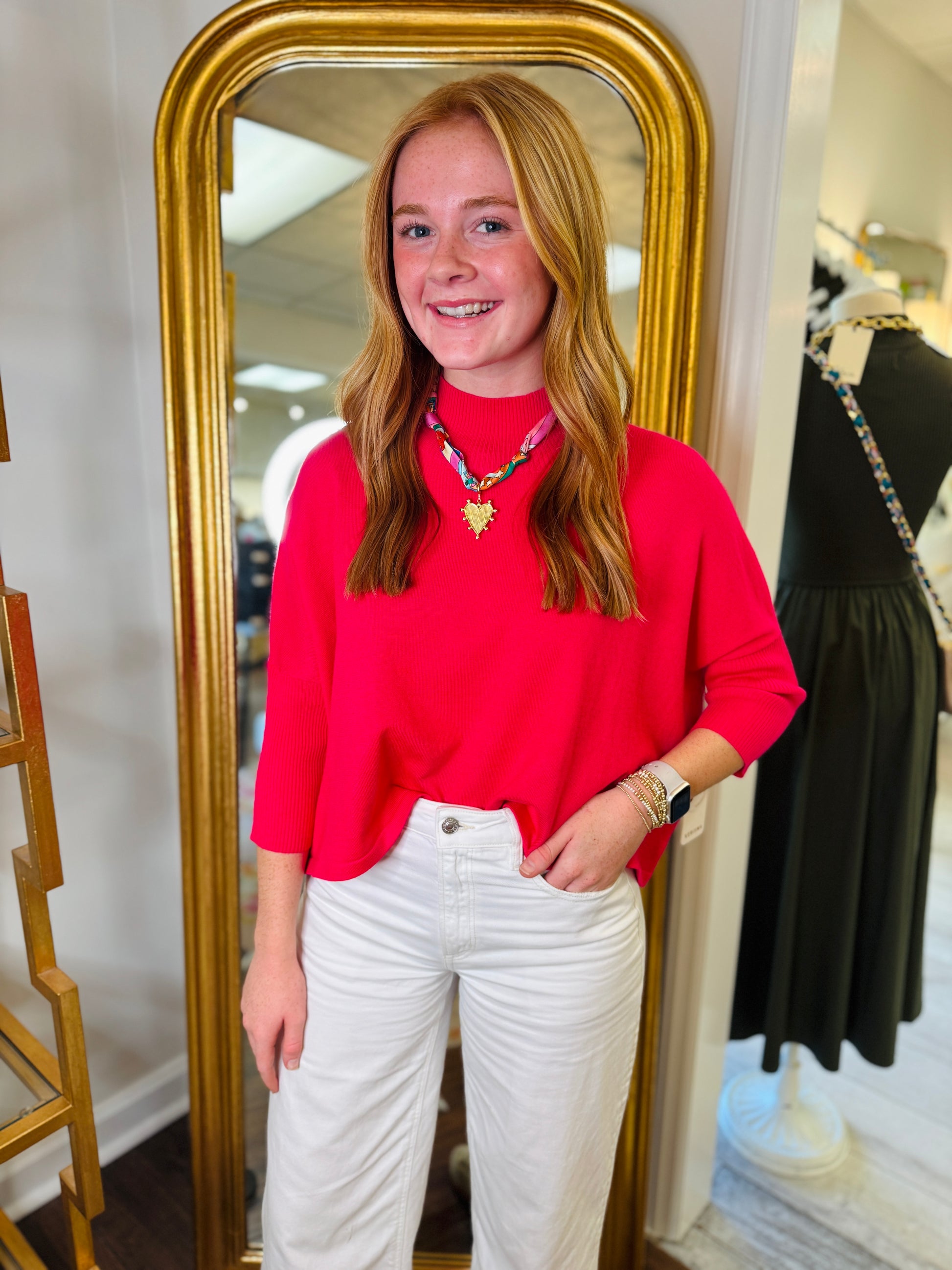 3/4 sleeve knit mock neck sweater with ribbed detail. Cropped in length.
