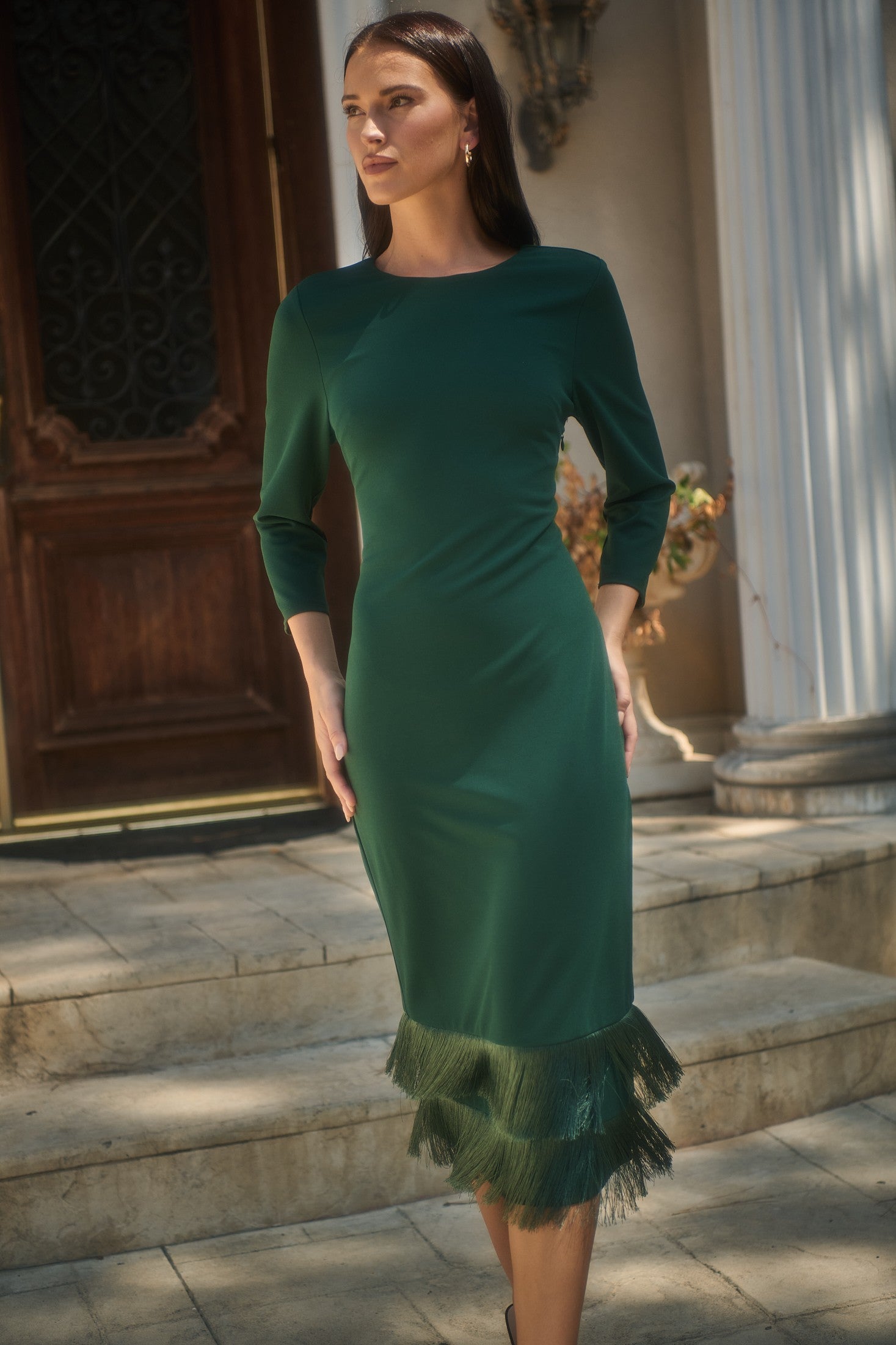 Make every moment unforgettable with this chic dress made to stand out. Featuring a round neck, long sleeves, and a flattering midi length, it’s finished with a playful fringe hem for the perfect touch of movement. Style it with strappy heels, a sleek clutch, and bold earrings for a look that takes you from dinner to dancing with ease. - Long sleeves - Midi - Fringe - Zipper - Color: Emerald Size + Fit - Model is 5'9" and wearing size XS - Measurements taken from size S - Chest: 17" - Length: 47 1/2"