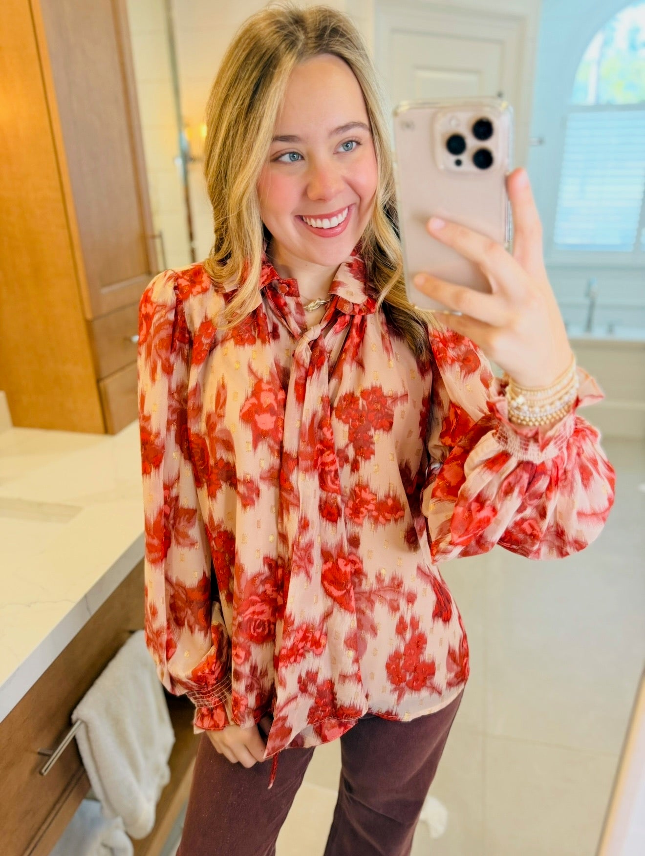 Long sleeve blouson top with smocked cuffs on sleeve and bow tie detail.