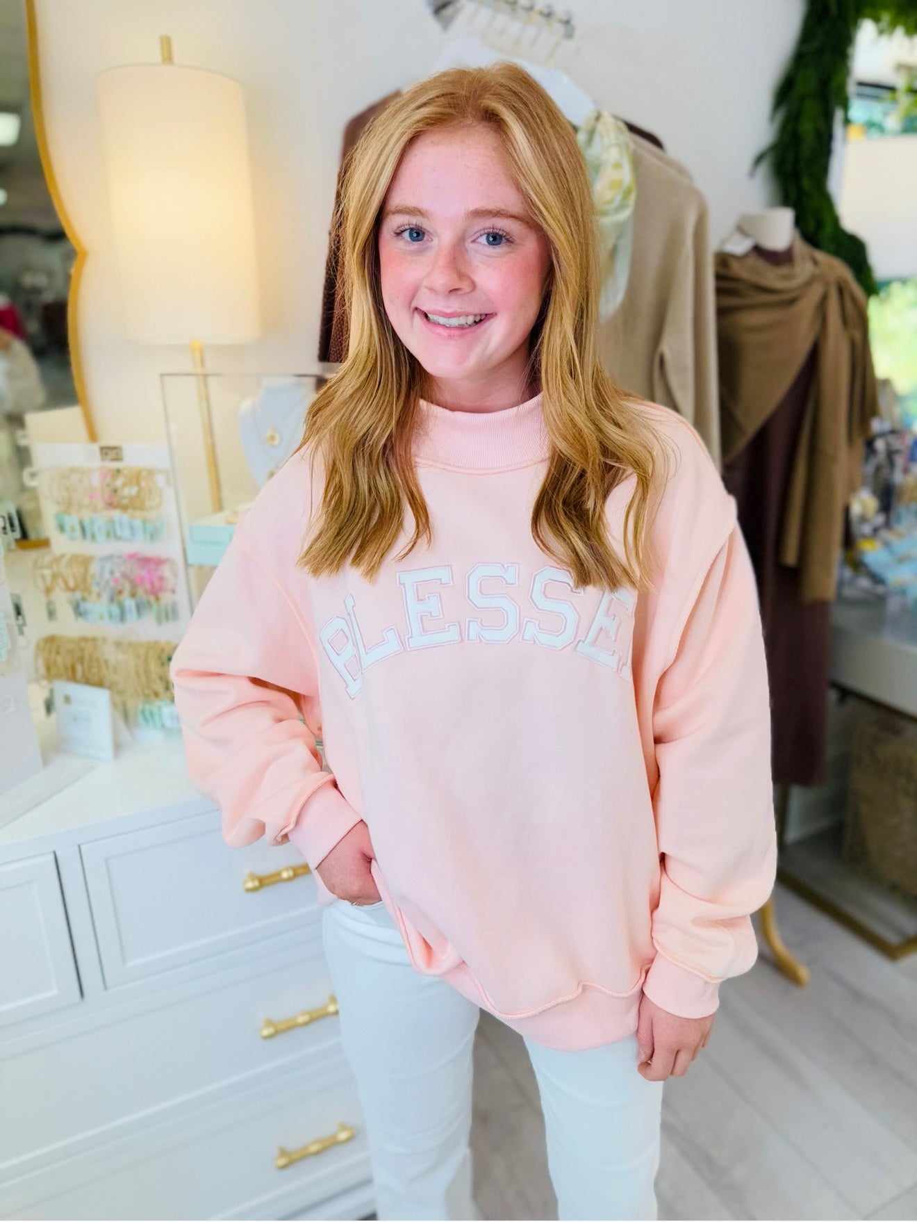 'BLESSED' Embroidered Mock Neck Sweatshirt - Mock-neck - Drop shoulder, long sleeves - Softest cozy fleece - Oversized fit - Rib banded hemline and cuffs - Not reversible design.