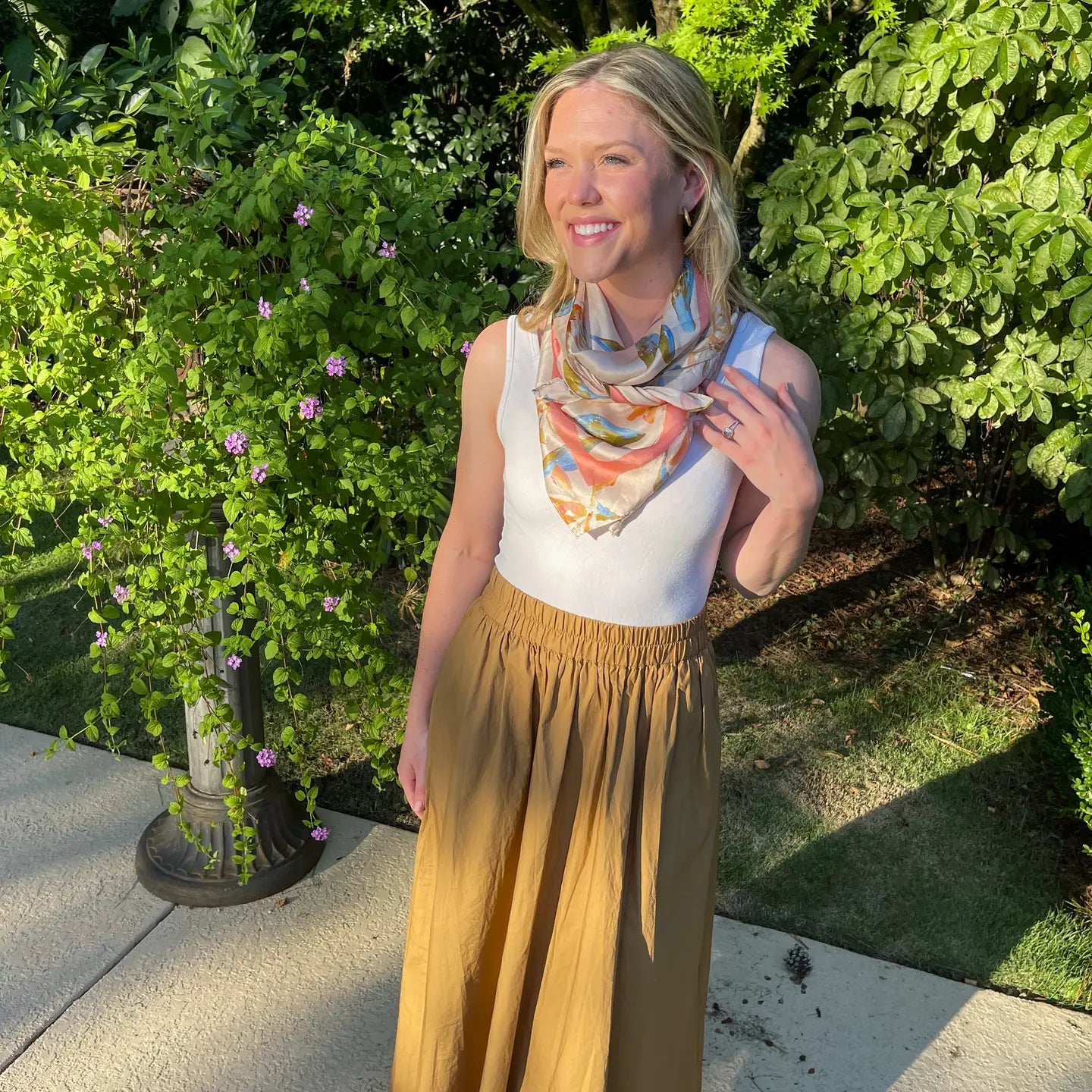 Material: 100% Silk Care Instructions: Hand wash in cold water using a mild detergent. You can use baby shampoo, dish soap, or a laundry detergent made for delicates. Soak the scarf for up to 5 minutes, then gently swish it around. Rinse with cold water, remove excess water, and lay flat or hang to dry.