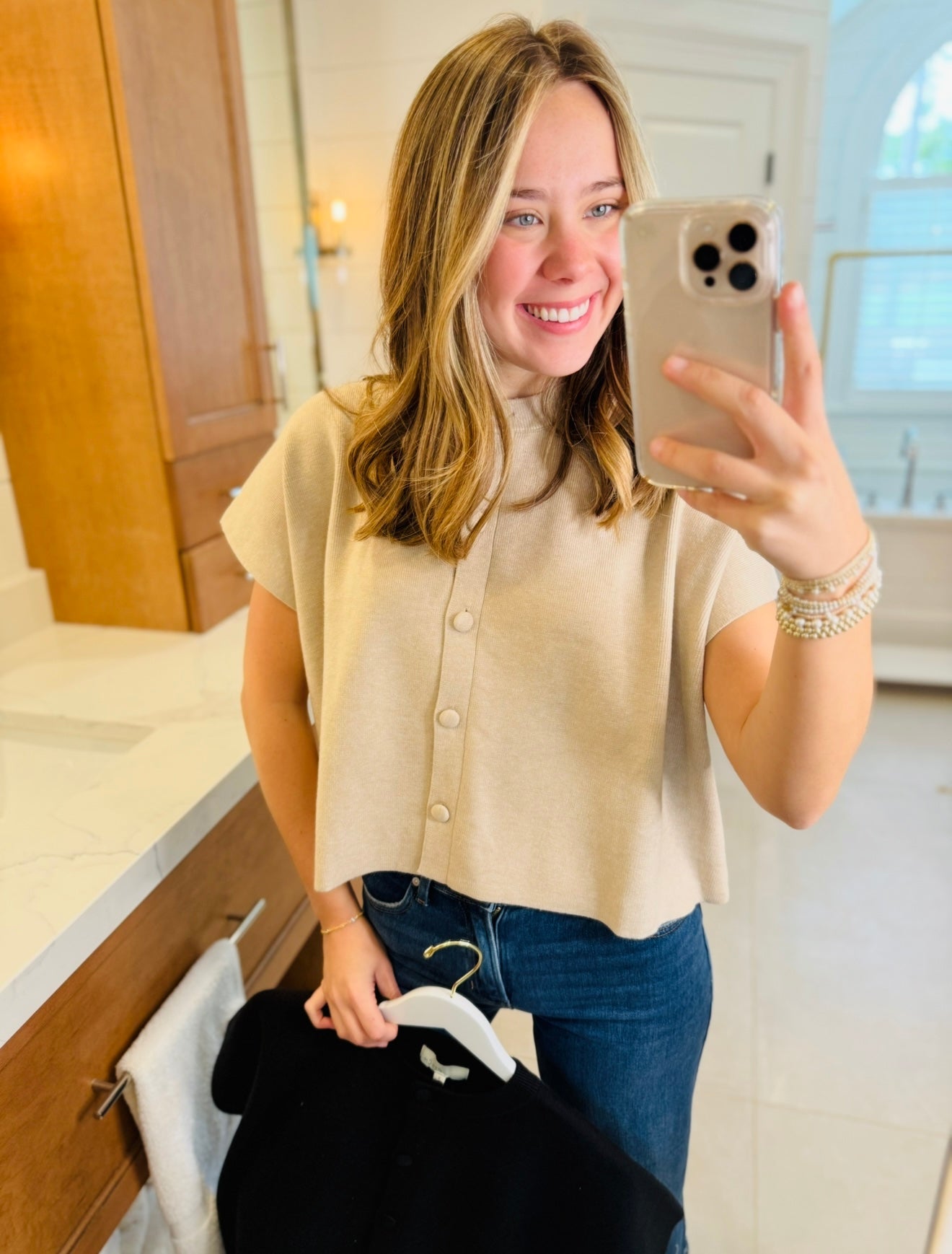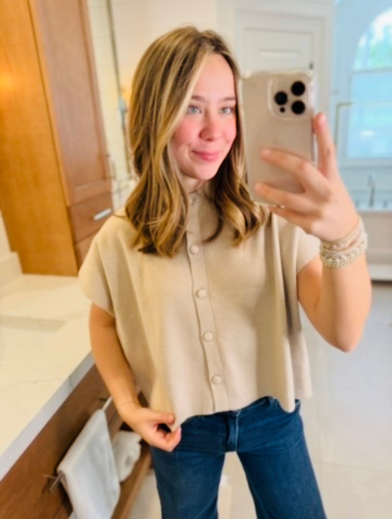 ROUND NECK BUTTON DOWN CAP SLEEVE MODEL WEARS A SIZE SMALL