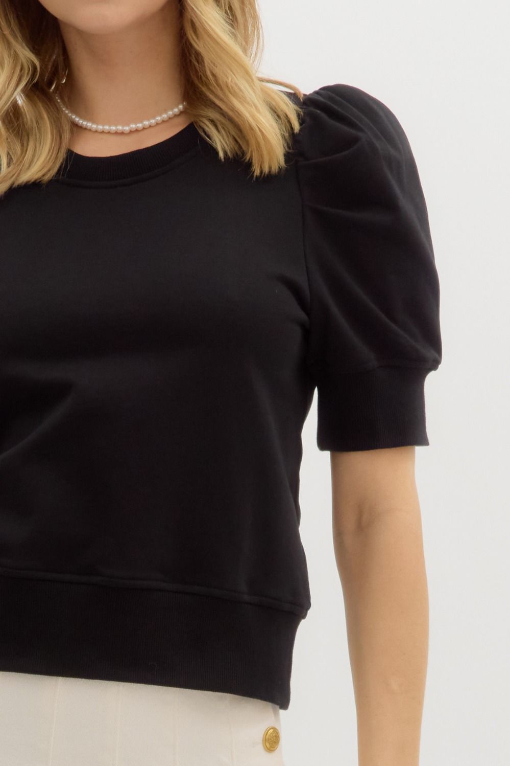 Solid crewneck jersey knit pullover top featuring pleated short sleeve. Unlined. Knit. Non-sheer. Lightweight.