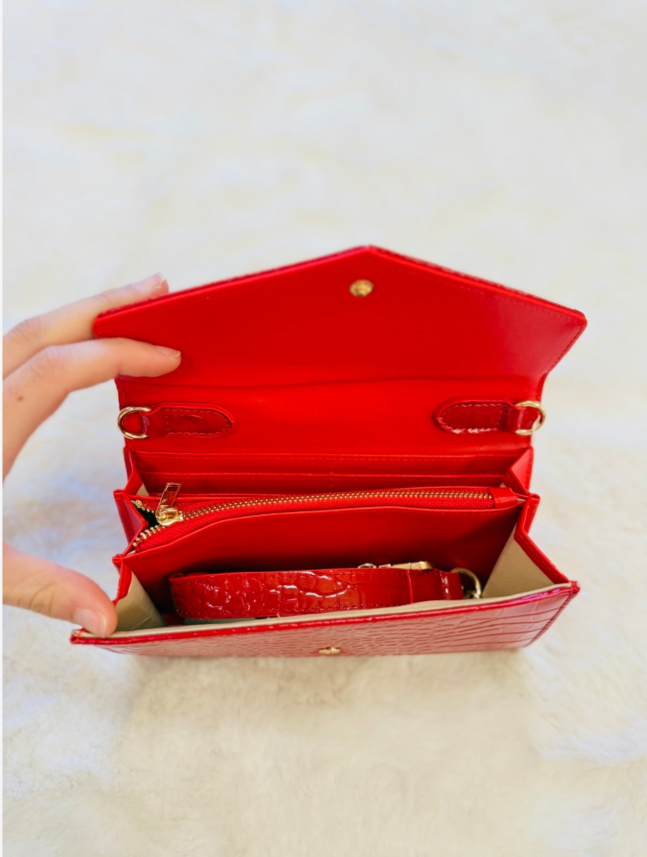 Red patent leather Clutch/Crossbody. Has card slots and zipper. With snap closure measures 8 inches long and 4 inches tall.