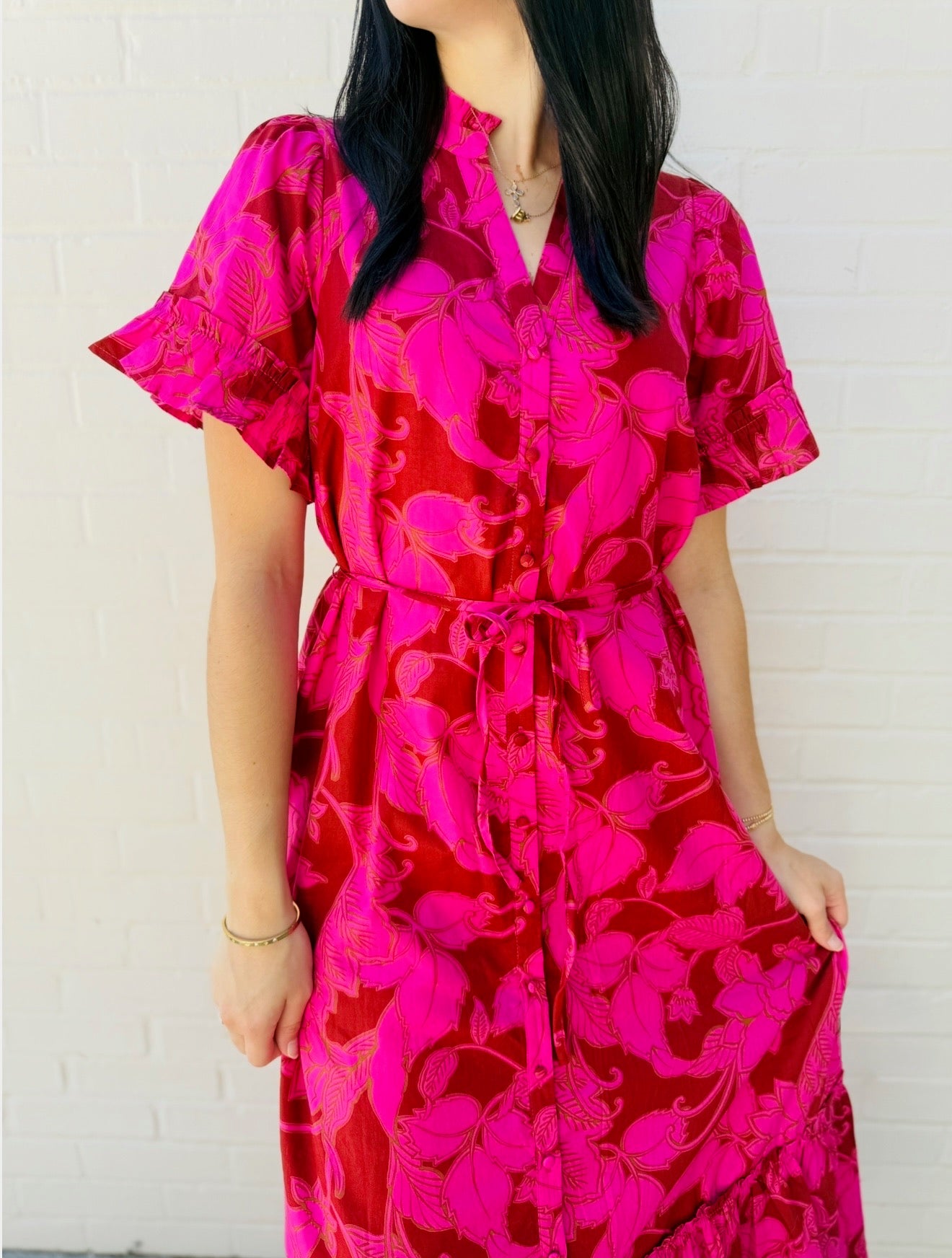 Turn heads in bold florals with our Craney Floral Alna Button Up Midi Dress. Featuring a vibrant pink-on-red print, this flowy dress is designed with short ruffle sleeves, a button front, adjustable waist tie, and tiered hem for effortless charm. Perfect for any occasion, from brunch to evening plans. - Pockets - Midi - Floral - Ruffle short sleeves - Color: Burg Pink Size + Fit - Model is 5'9 and wearing size XS - Measurements taken from size S - Chest: 20 1/2" - Length: 55"