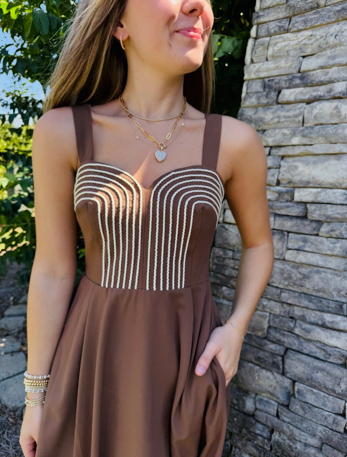 Braid embroidery detail midi dress in stretch suiting fabric. This long dress features a sweetheart neckline, adjustable straps, smocked stretch back bodice, side pockets, lining, hidden zipper closure and midi skirt with pleat detail.