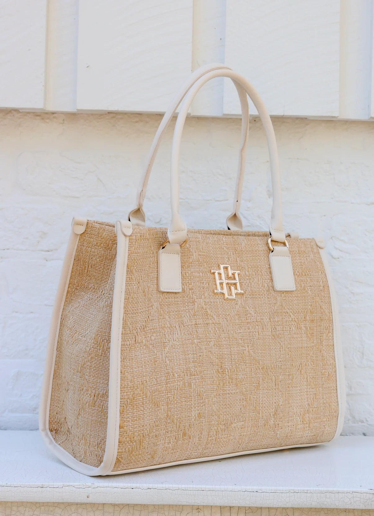 This fabulous tote has a simple silhouette with a trendy design that pairs well with any outfit. It features a lattice straw material with a neutral tone vegan leather trim. A top zipper closure ensures privacy and security for all of your items, and the two elongated handles offer comfortability when wearing this bag. the spacious interior has two open pockets and one zippered pocket to aid in organization. It also has feet on the bottom for added protection and durability.