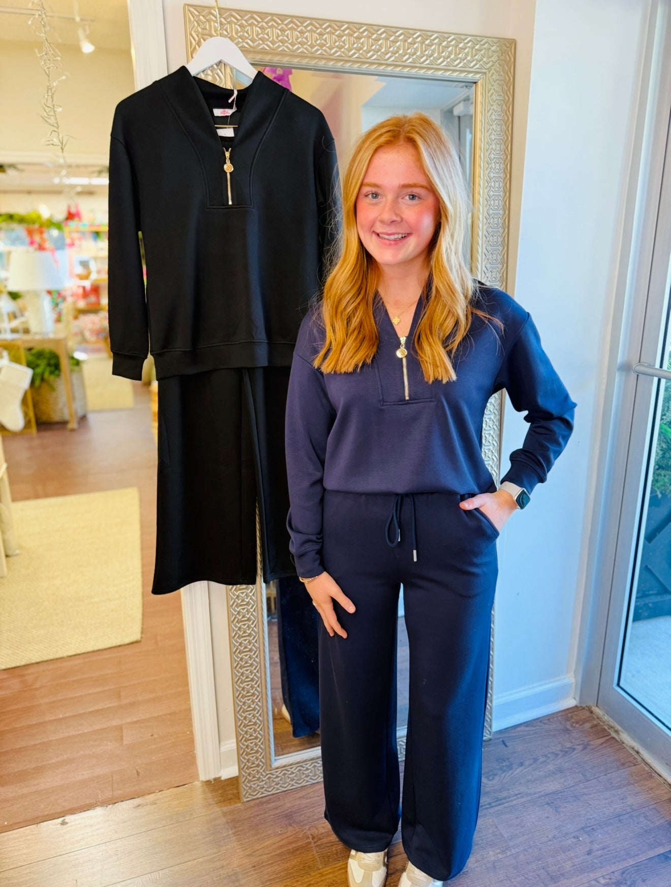 Super soft and stretchy half zip pullover with gold hardware paired bag with elastic tie waist jogger. Sold as a set! Ivy Model is wearing the xs!