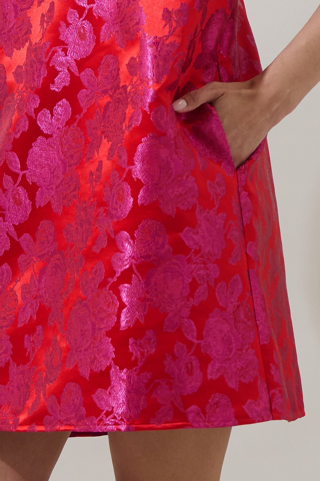 Make every outing feel special with a look that naturally draws admiration. This mini dress features a rounded bib neck, half oversized balloon sleeves, functional side pockets, jacquard fabric, and a delicate floral pattern. Complete the outfit with strappy heels, a structured handbag, and minimal jewelry for a stylish, refined touch. - Jacquard - Shift dress - Mini - Keyhole back - Color: Pink Red Size + Fit - Model is 5'9" and wearing size XS - Measurements taken from size S - Chest: 20 1/2" - Length: 34 1/2"