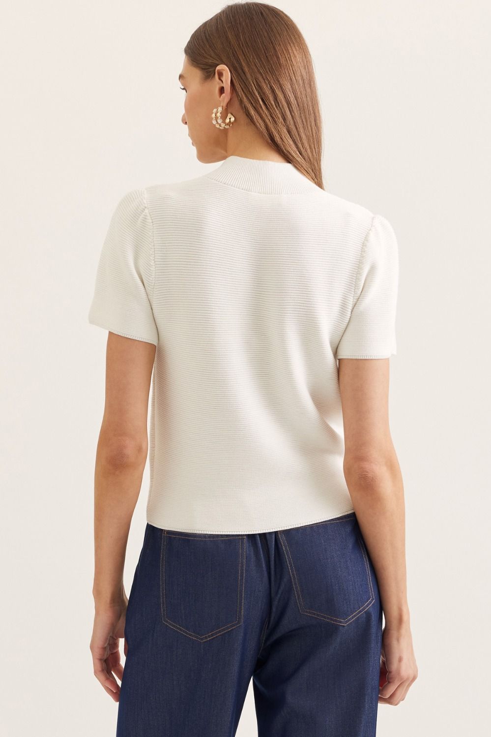 Solid short puff sleeve mock neck knit top featuring textured rib knit. Unlined. Knit. Non-sheer. Lightweight.