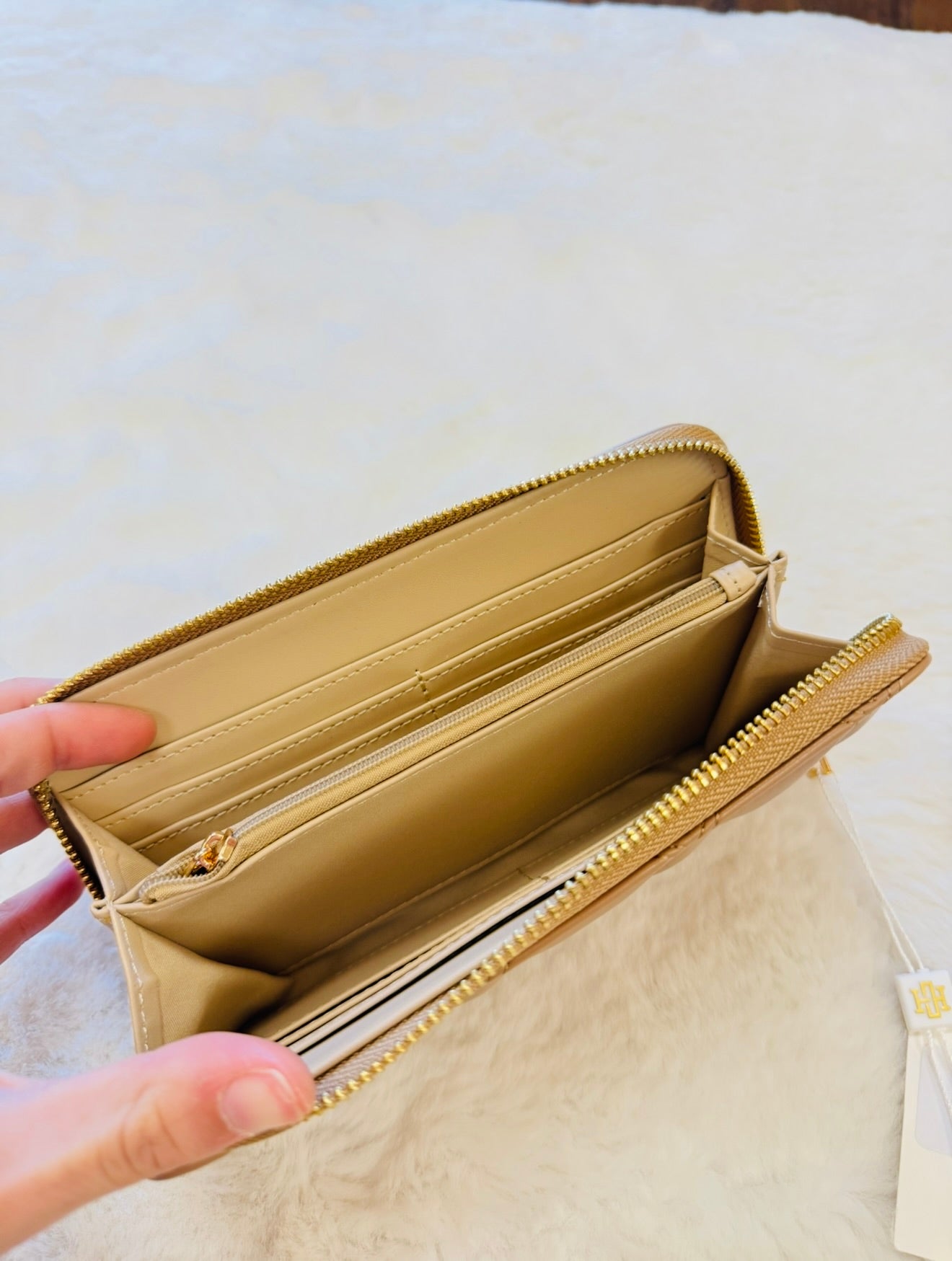 Quilted long zipper wallet with card slots. Measures 8 inches long by 4 inches tall.