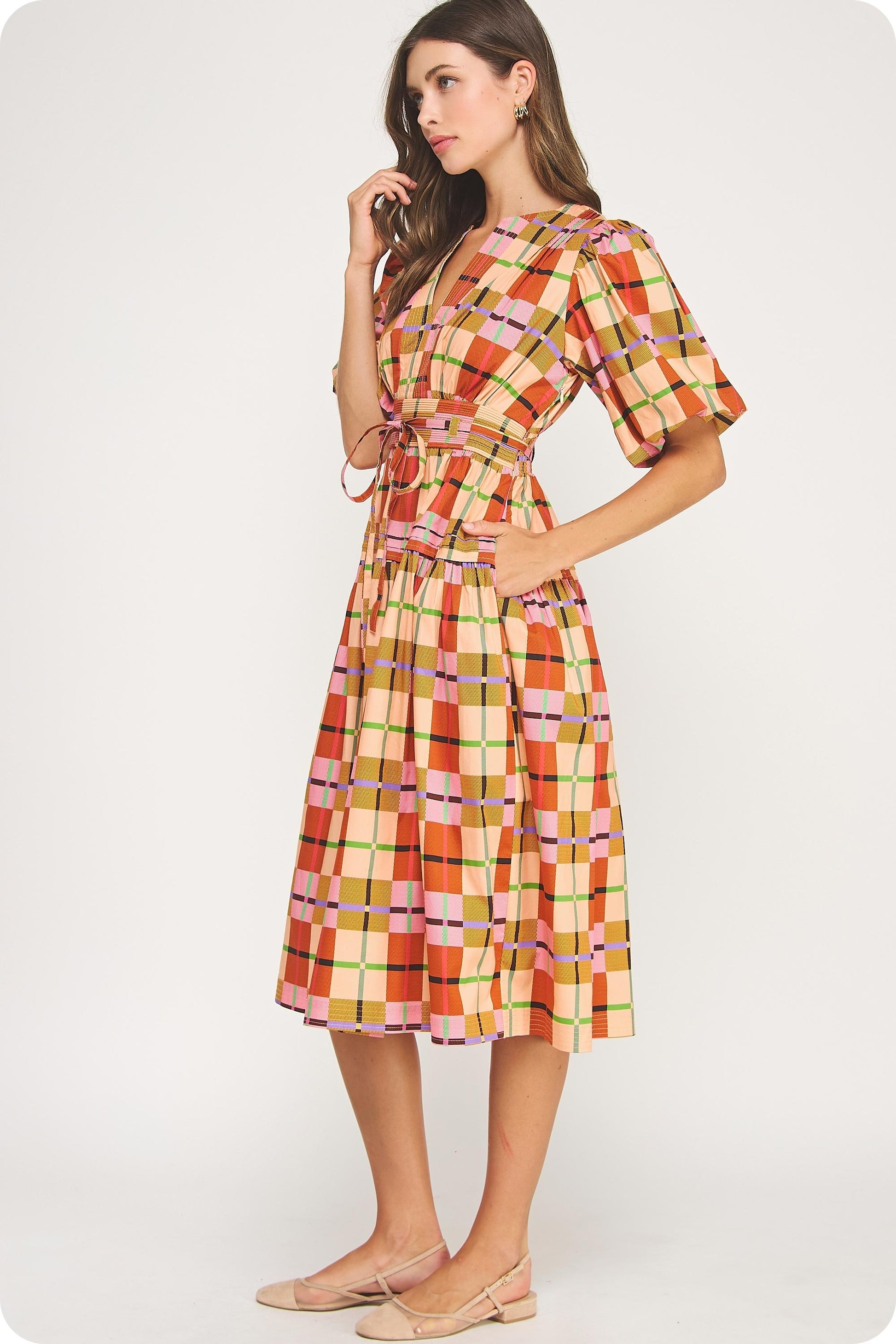 Puff short sleeve midi dress an exclusive plaid print on poplin fabric. This long dress features puff short sleeves, a split V-neck, side pockets, A-line midi skirt with pintuck detail, side zipper closure, a removable waist tie, and cinched banded waist with stretch smock at back.