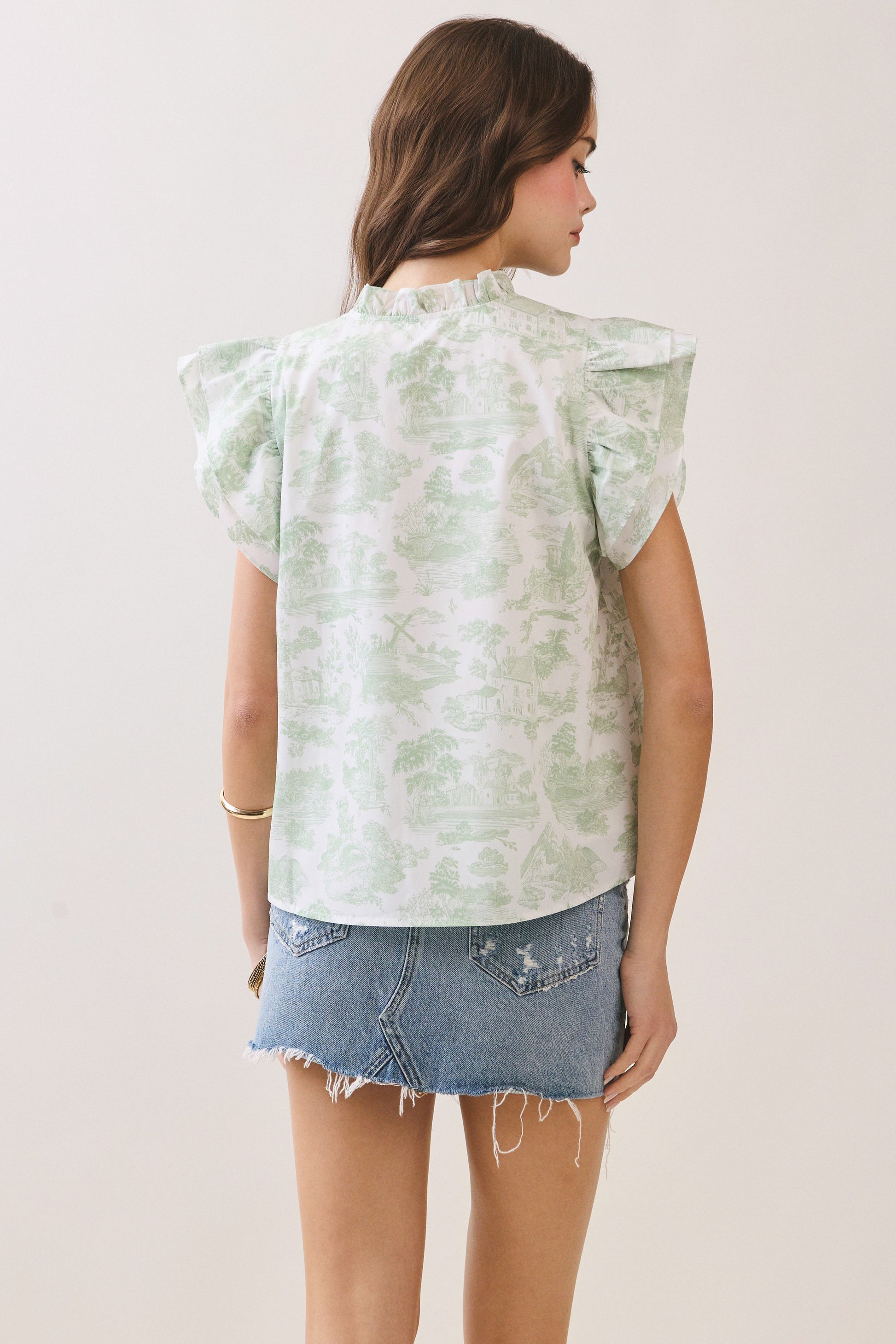 A floral-print top featuring a relaxed, boxy silhouette. Designed with short flutter sleeves and a split V-neckline accented with a band collar. Model Size + Fit: