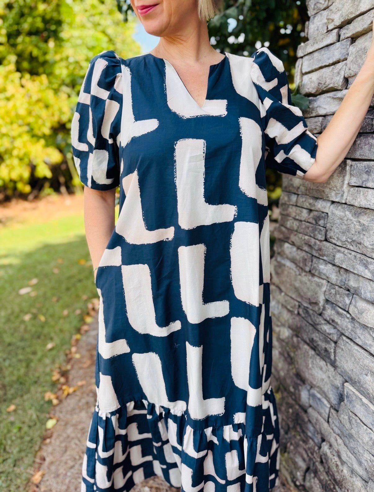 Print short puff sleeve midi dress featuring V-neck. Ruffle hem. Lined. Woven. Non-sheer. Lightweight.