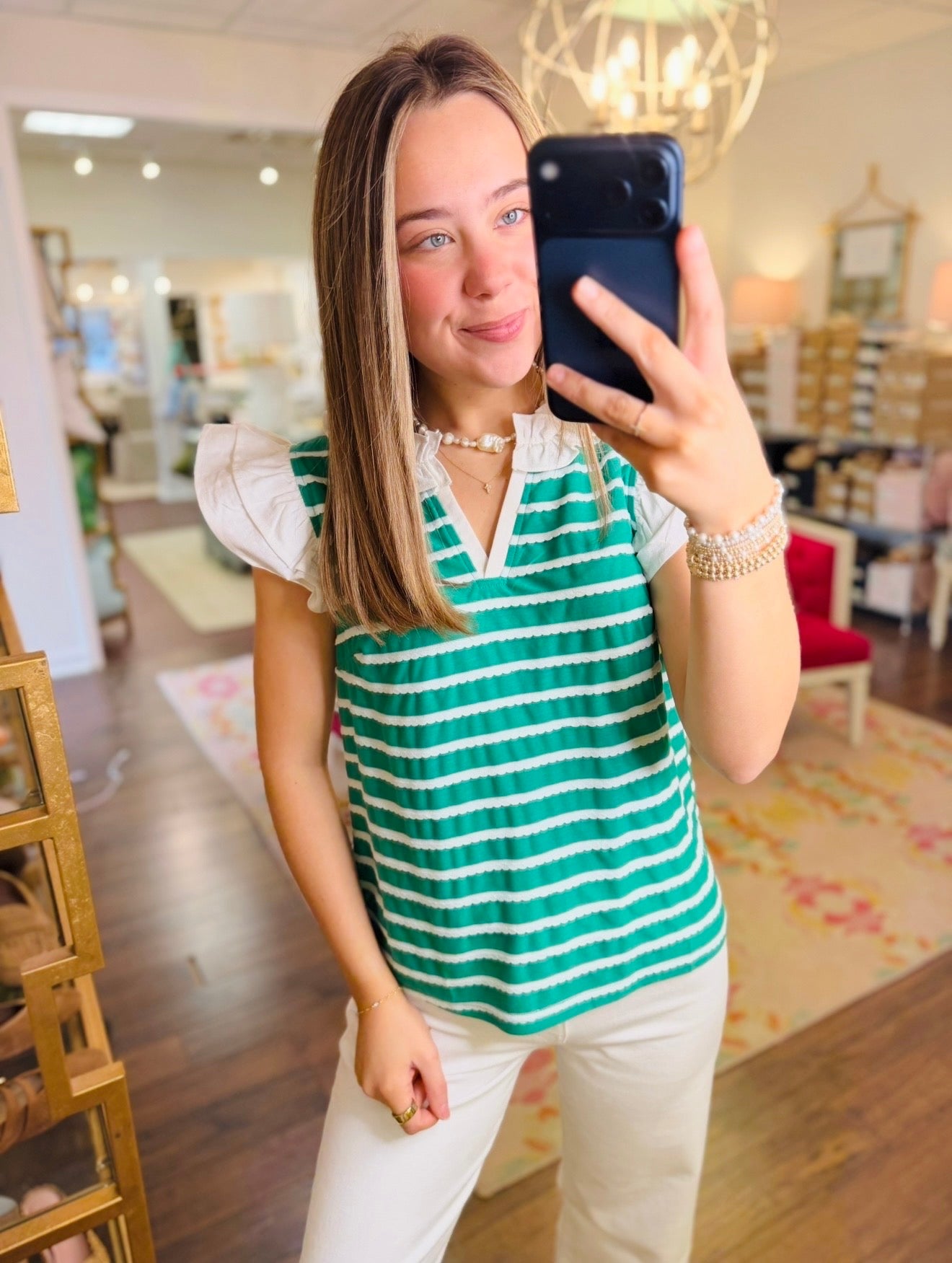 - V-neckline - Contrast double ruffle cap sleeve - Contrast ruffle neck - Stripe textured knit fabric Model height 5' 8", wearing size Small Striped short sleeve knit top featuring a ruffled neckline and contrast flutter sleeves for a feminine touch. Designed in a soft, lightweight fabric with a relaxed fit, this easy spring and summer top is perfect for everyday boutique styling and casual wear