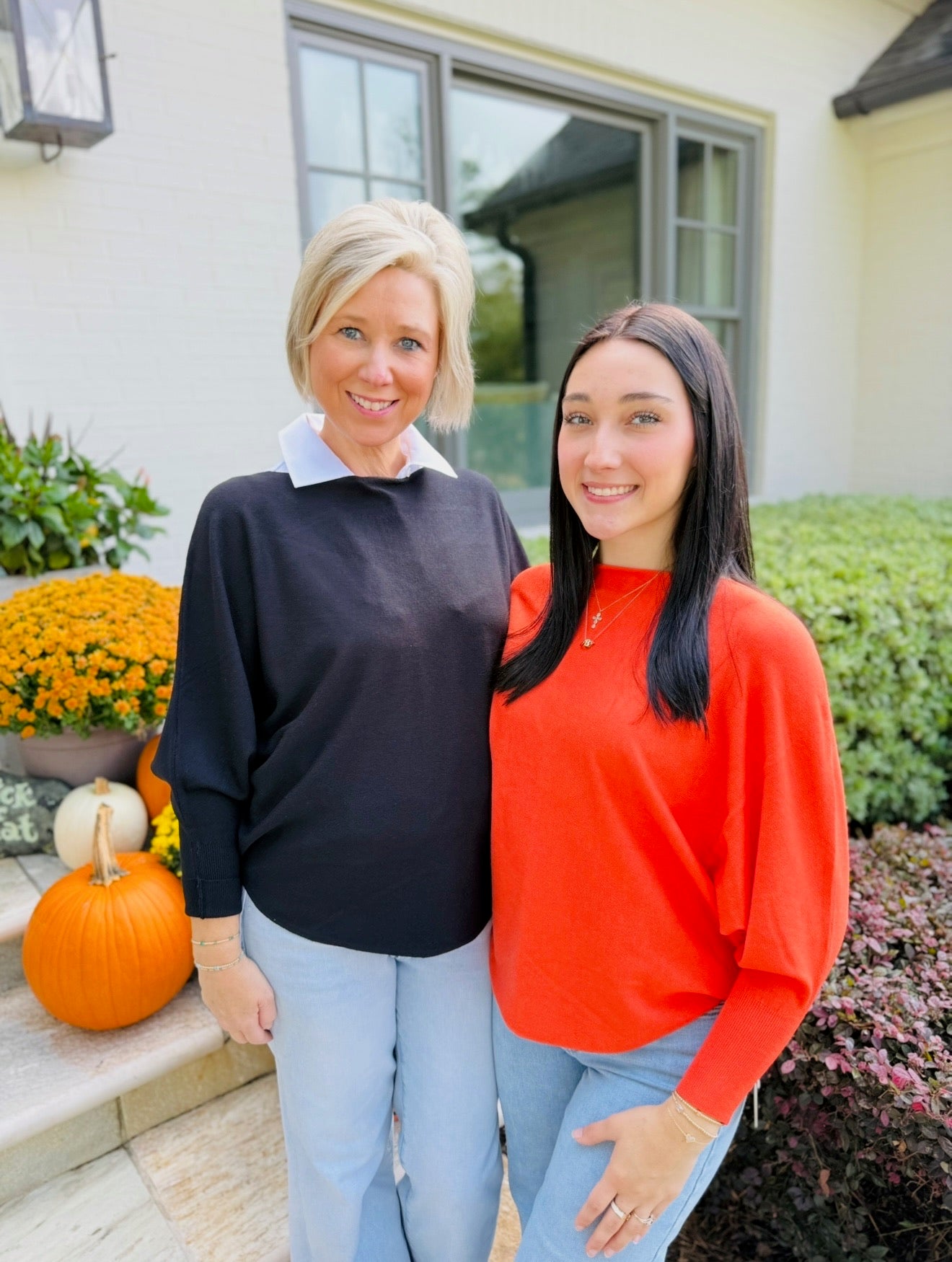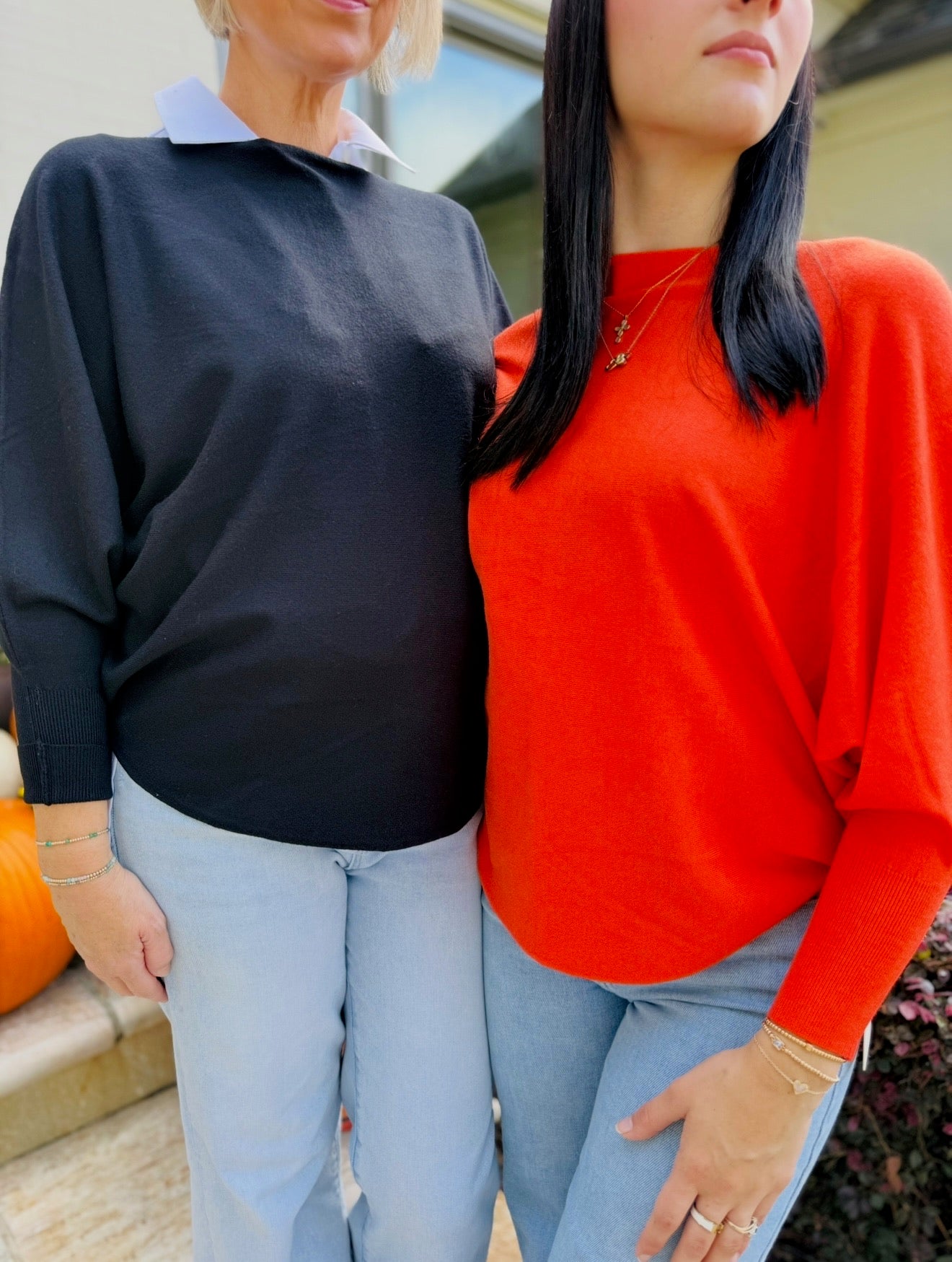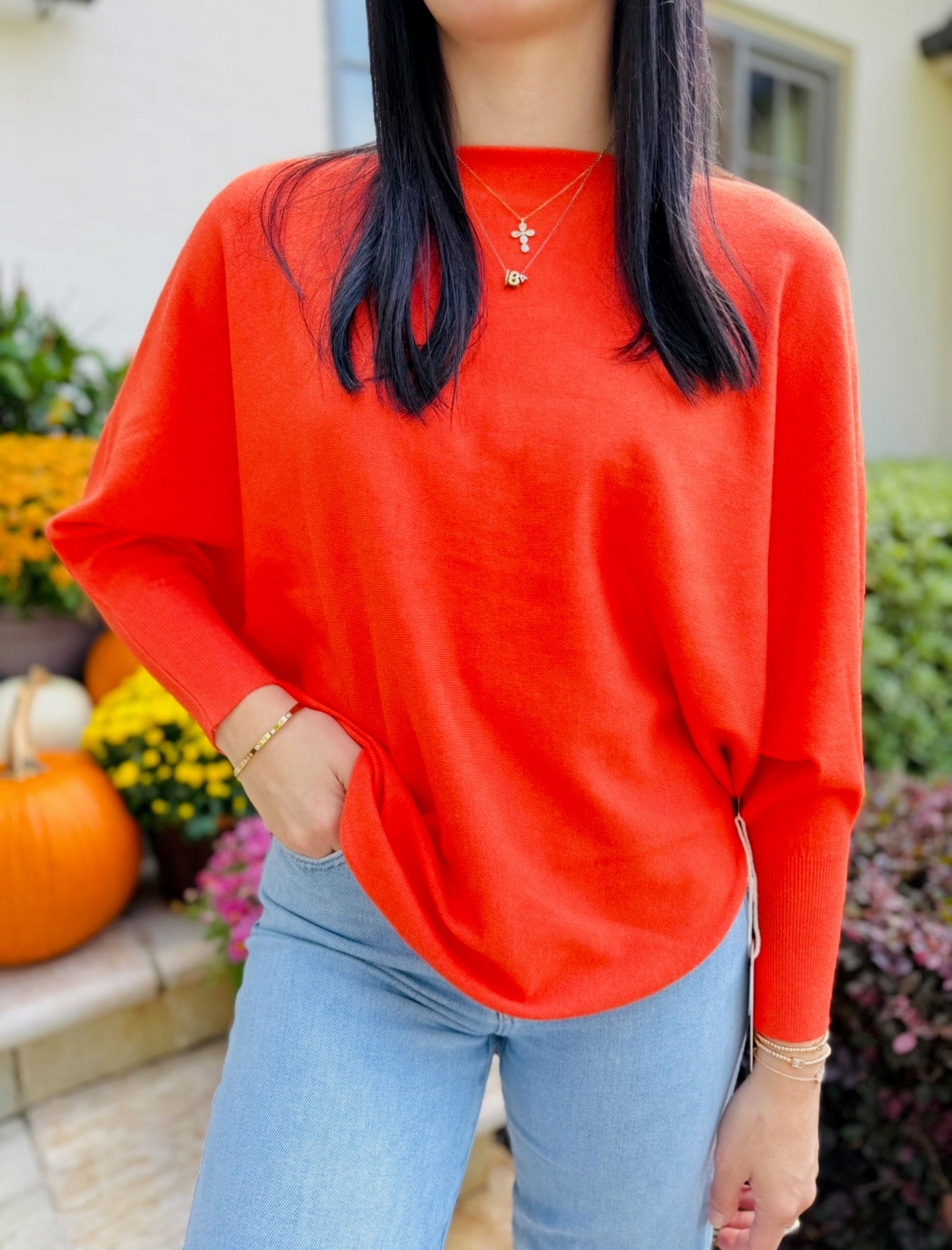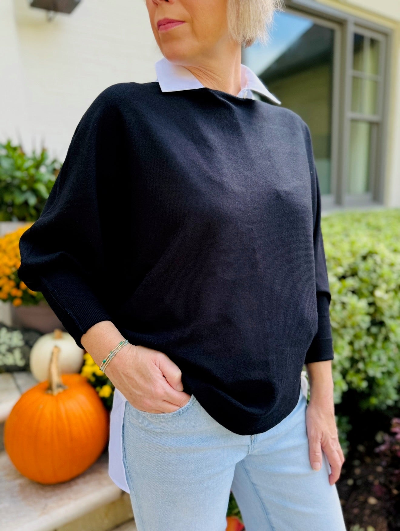 Boat neck top with 3/4 length Dolman sleeves and Curved sweep