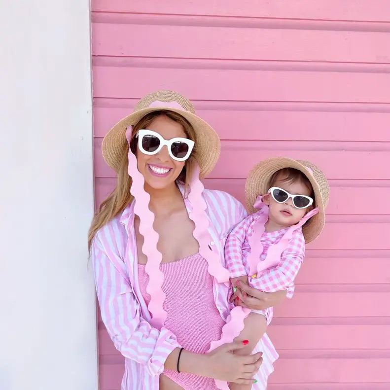 This stylish straw hat offers pretty protection from the sun. Each is integrated with a scalloped blue grosgrain ribbon in a shape that mimics the ocean’s waves to add a bit of whimsy for beach or pool days, bike rides, picnics, and everywhere in between.