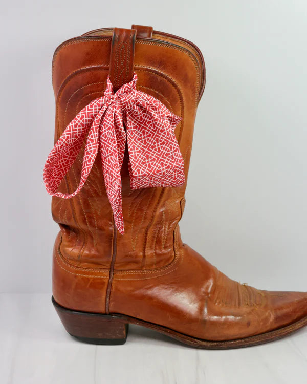 Add a stylish touch to any outfit with the Serafina Scarf in a classic red and white geometric print. Its smooth satin-like texture makes it perfect for tying around your neck, wrist, bag, or even your cowgirl boots, adding a playful and fashionable flair wherever you wear it.