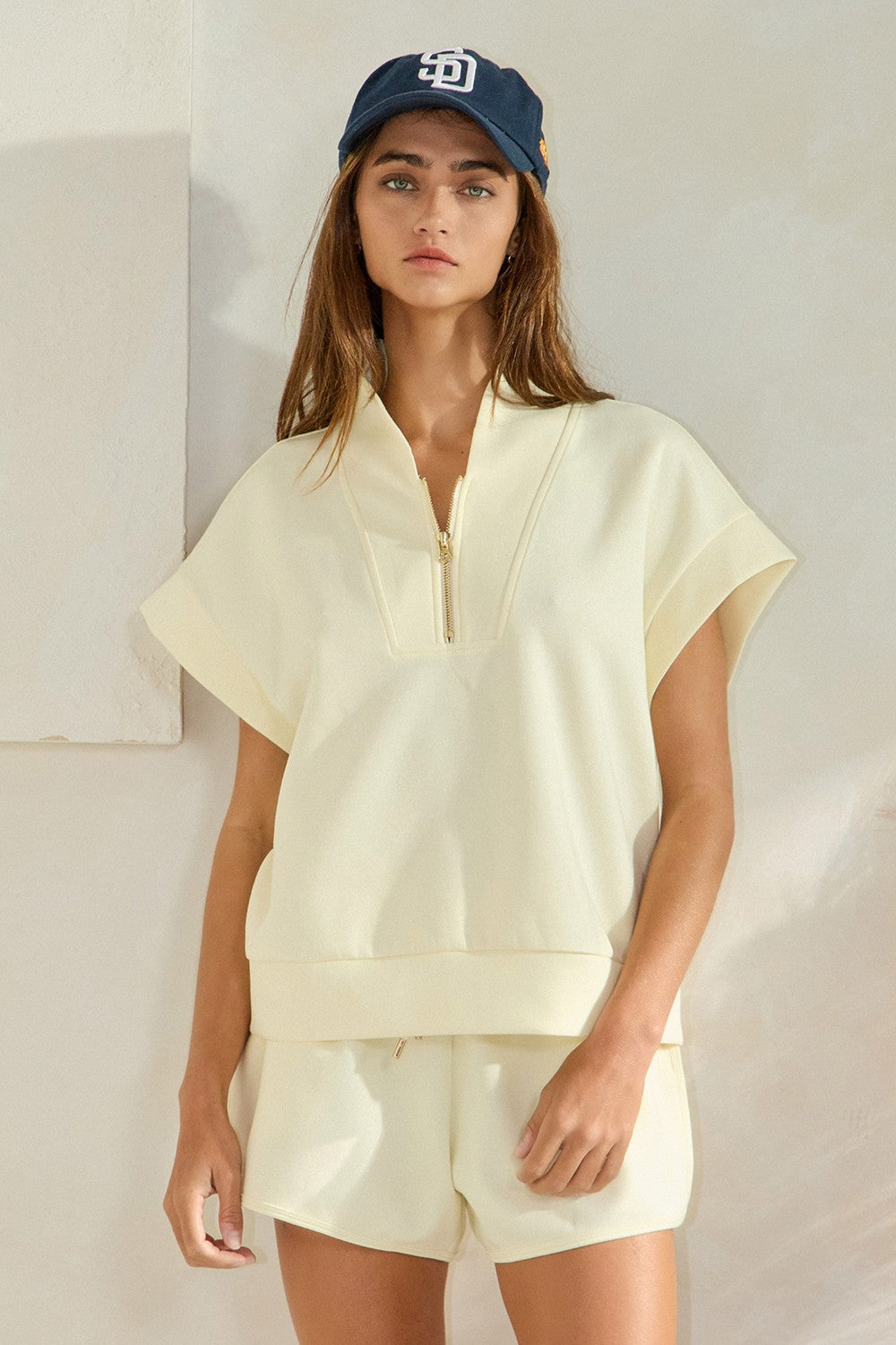 Short Sleeve Half Zip-Up Scuba Sweatshirts. Can pair back with Siggie Scuba Short for a set! - Zip-up front - Short sleeves - Soft and cozy scuba fabric