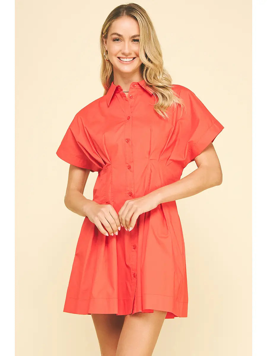 Basic collar dress with tucked and pleated detail. Has button down with cap sleeves and side pockets. Model wears a size small!