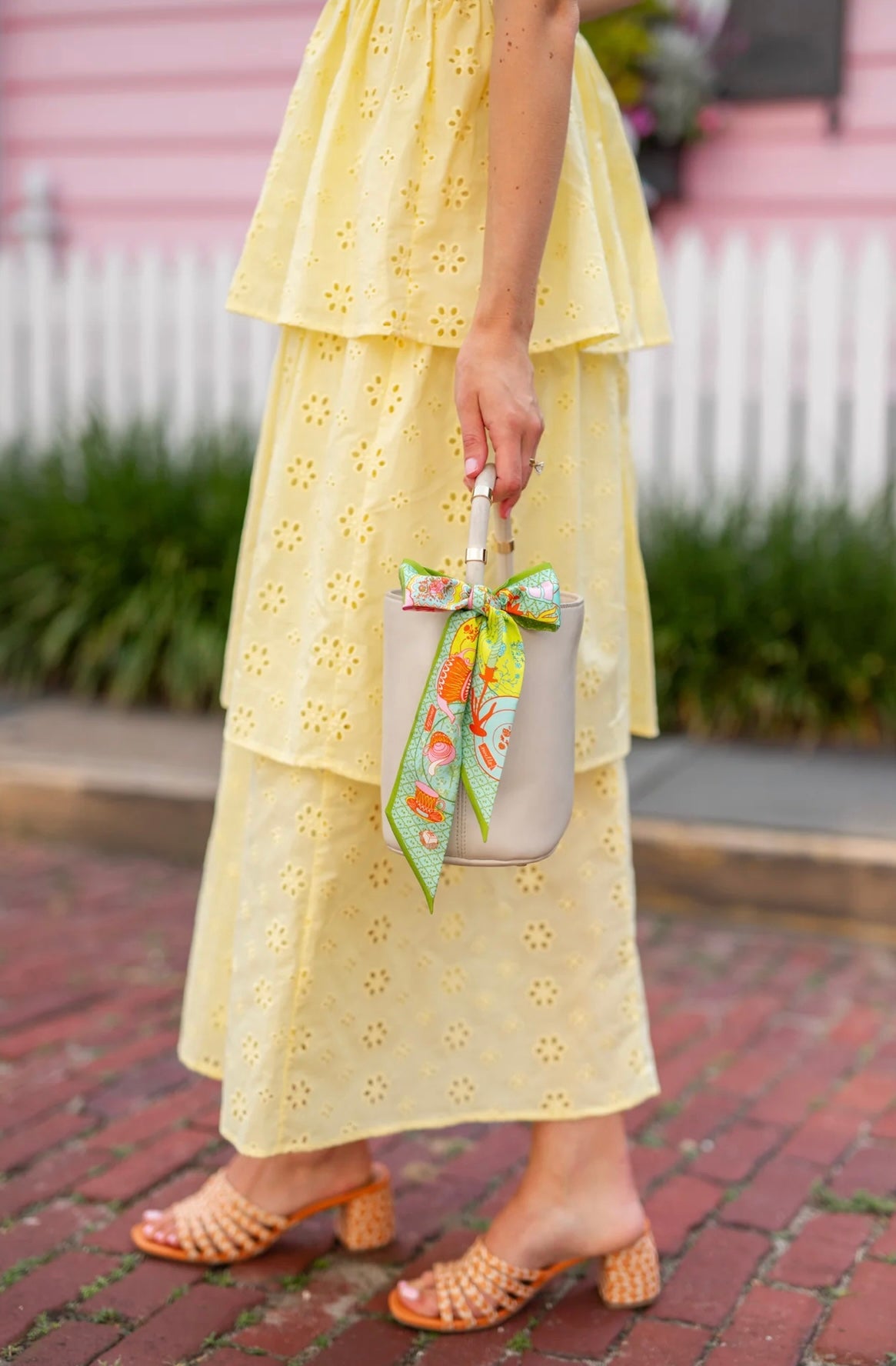 The Tea Party Ribbon is ready for summer soirée season! This 100% silk, hand-drawn scarf features illustrations of: vintage glasswear, classic china, croquet, candelabras, sweet treats, and of course a teapot + cups! Wear her on your bag, in your hair, with a necklace, or as a scarf. You won't want to go without it this summer!