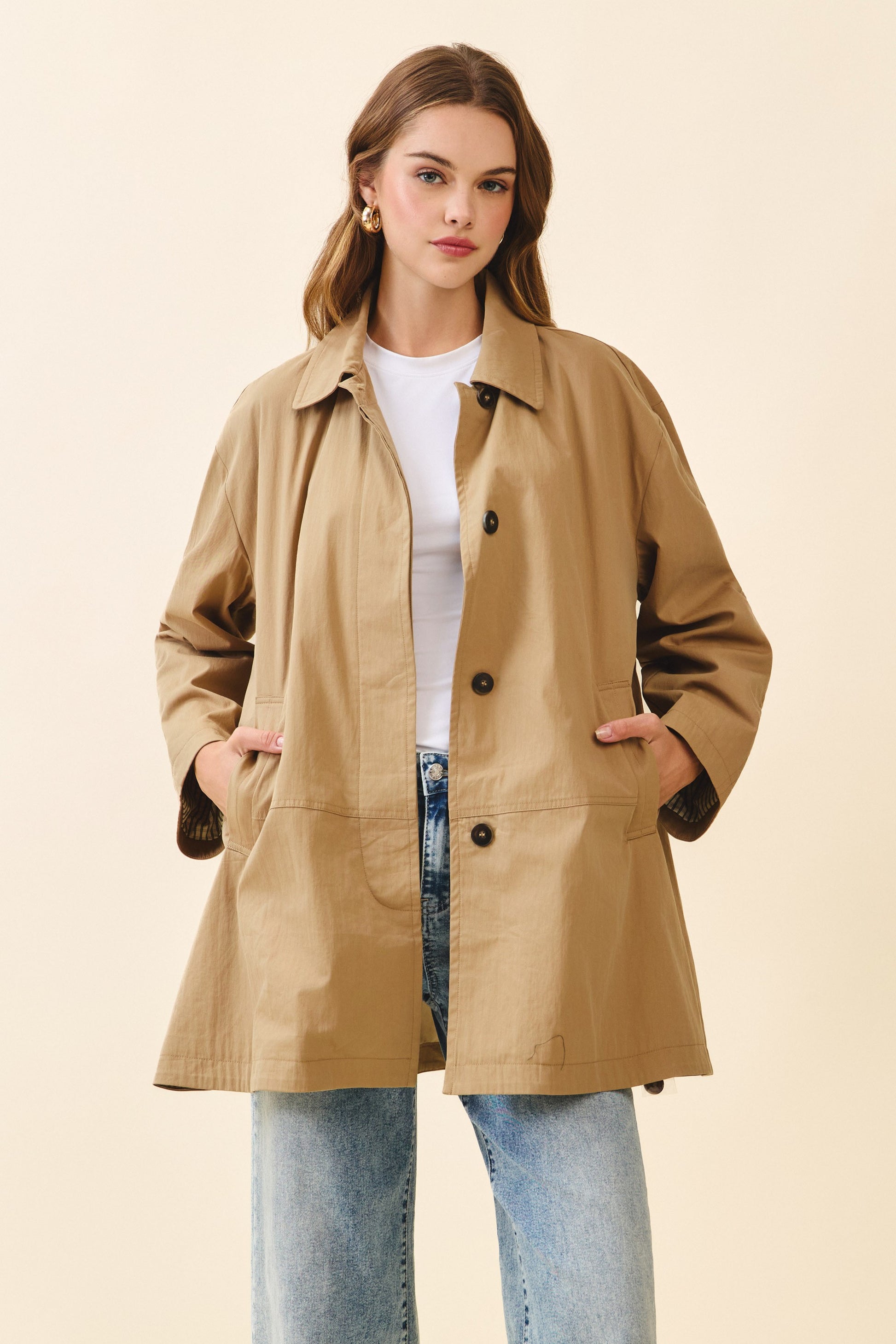 A relaxed-fit utility jacket featuring a classic spread collar, front button closures, and dropped shoulders. Finished with front welt pockets and a subtly flared hem. Model Size + Fit: Model height: 5'11" Dress size: Small Bust: 31.5 Waist: 23.5 Hips: 35