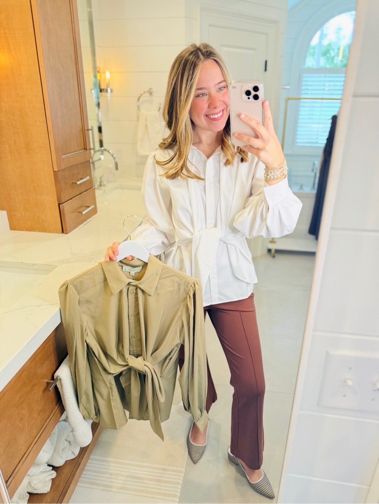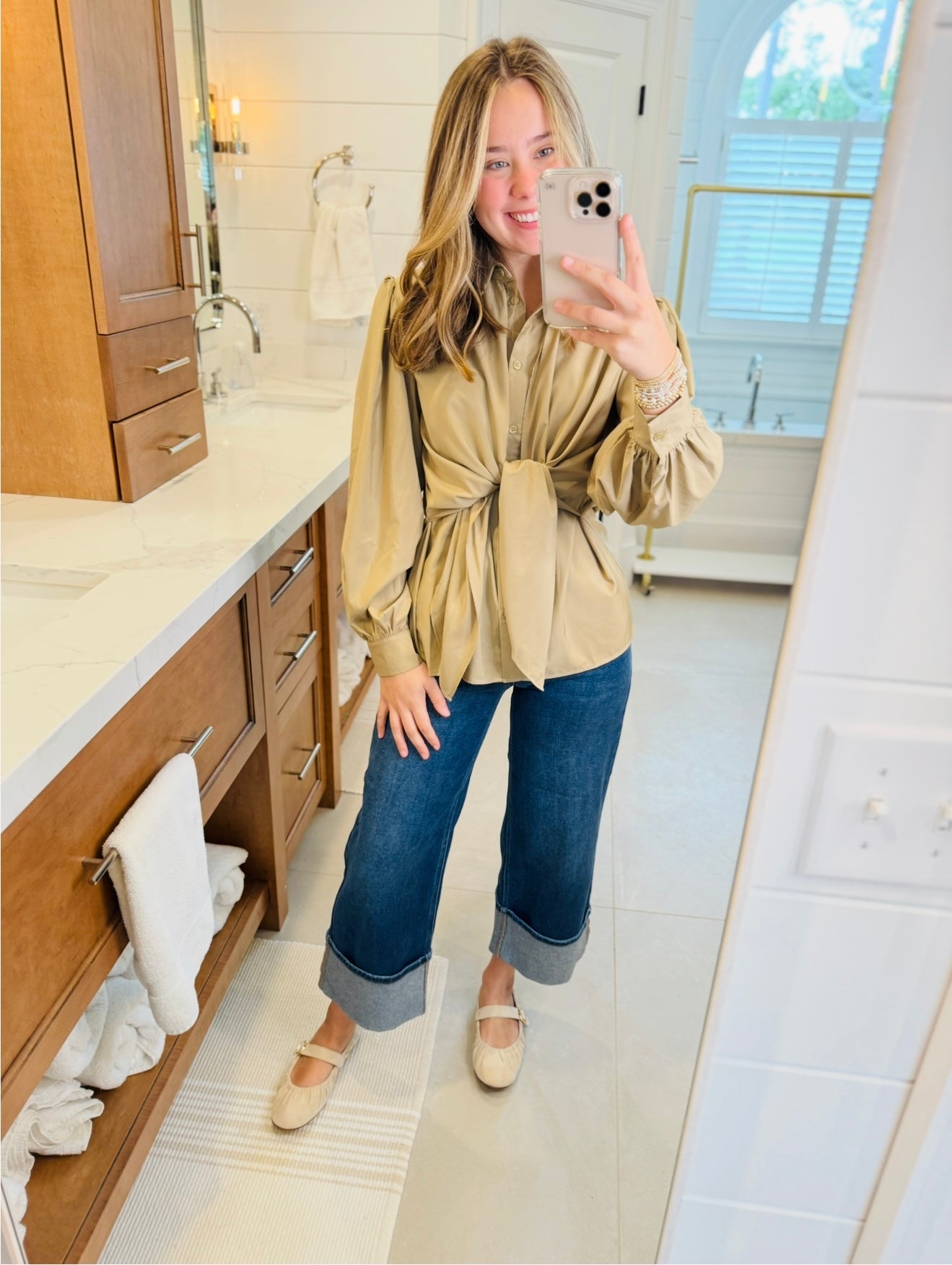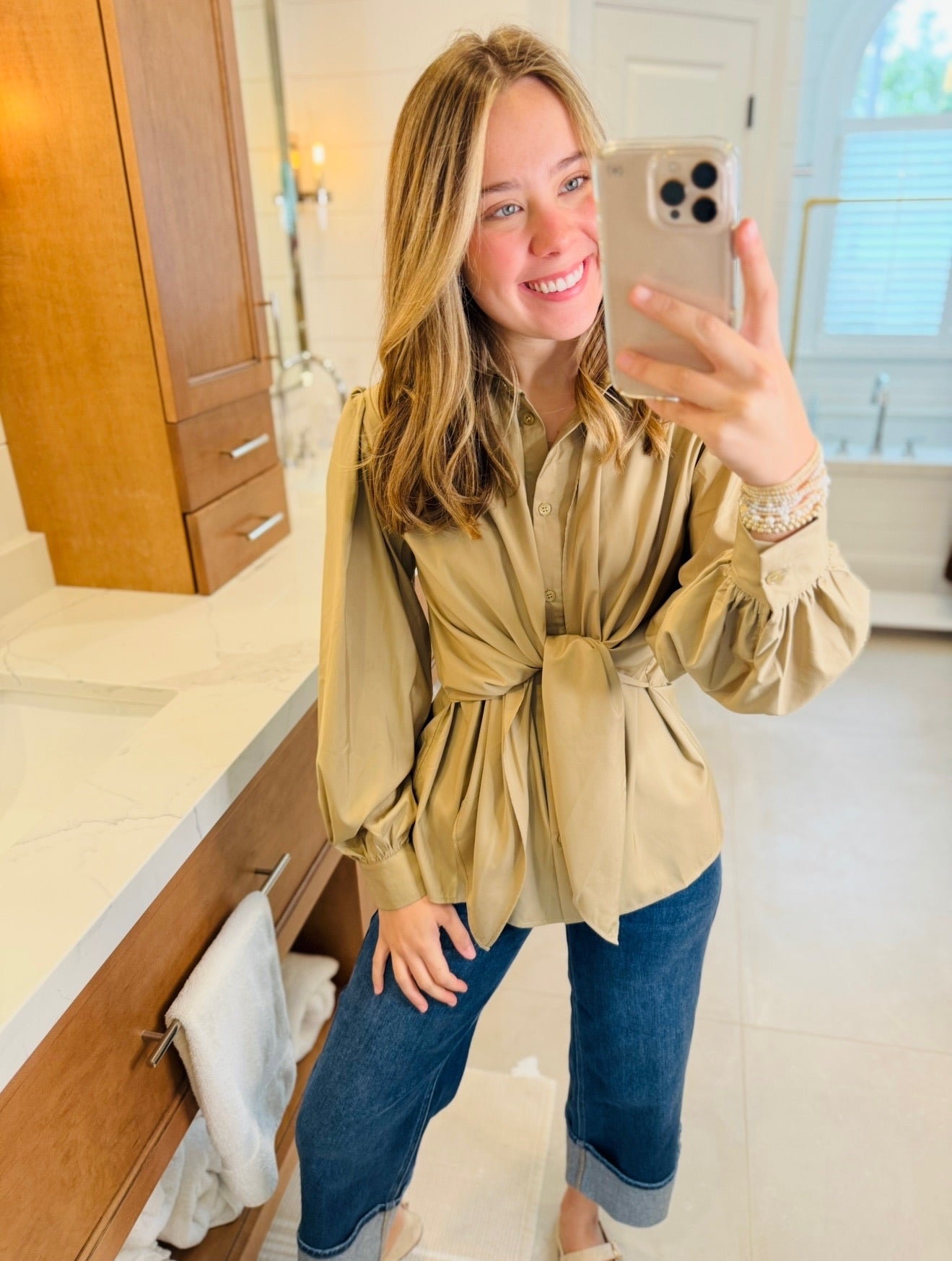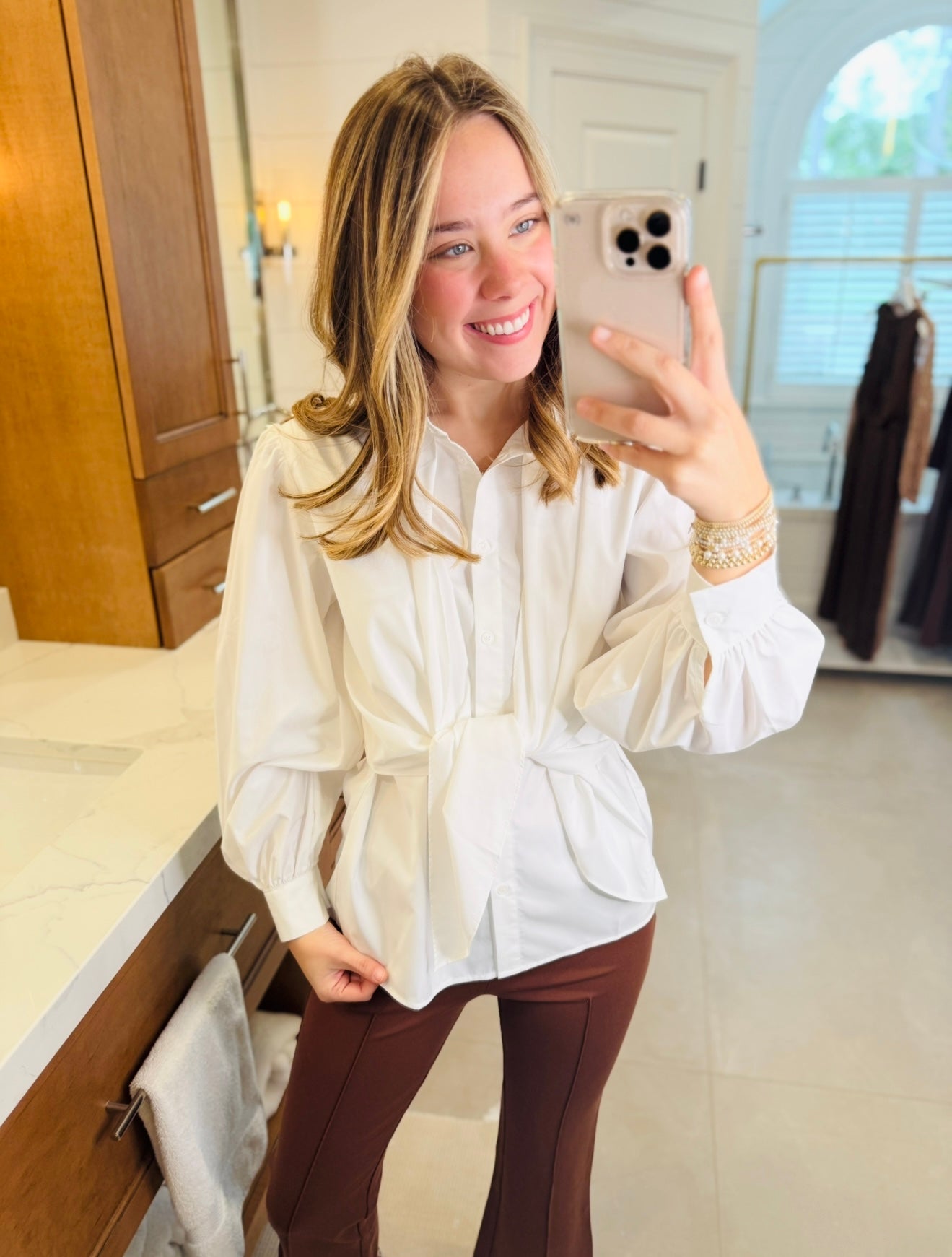 BASIC COLLAR BUTTON DOWN TIE DETAIL BALLOON SLEEVE MODEL WEARS A SIZE SMALL