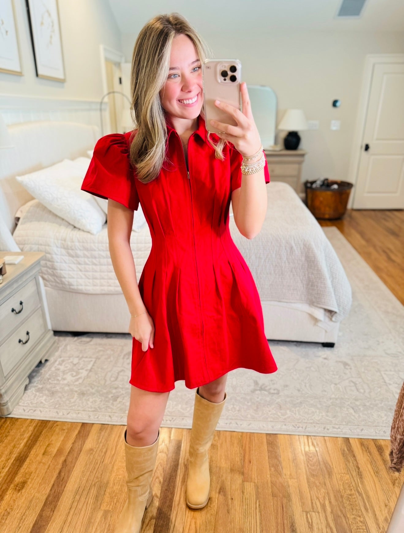 Utility mini dress with zipper front detail and flutter sleeve.