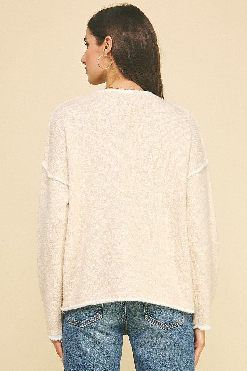 V-NECK CONTRAST YARN DETAIL LONG SLEEVES MODEL WEARS A SIZE SMALL