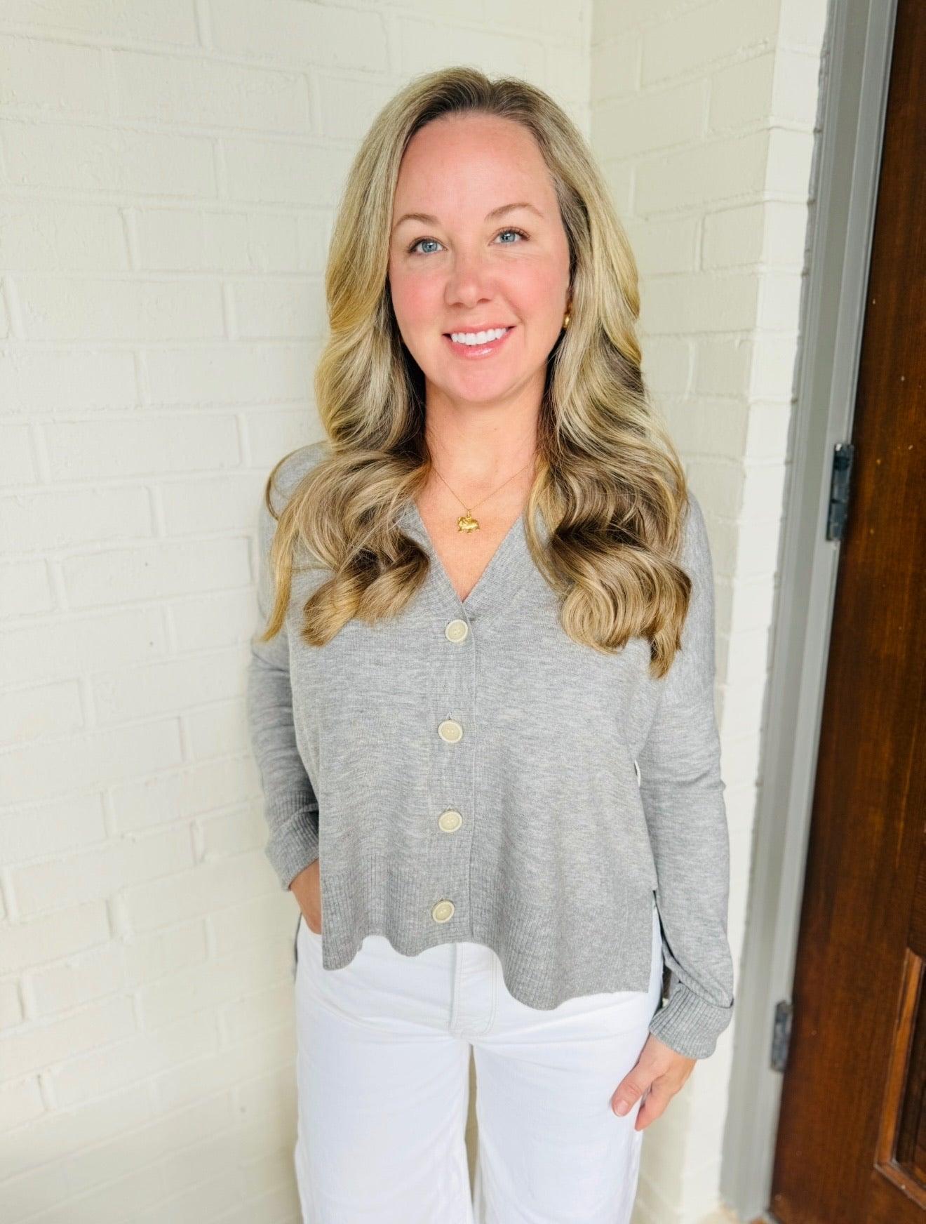 Oversized V-neck button down cardigan with long sleeves and curved hi/lo back sweep